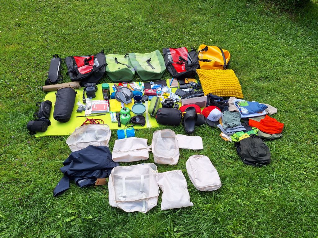 So weit, so gut – welche Dinge braucht man denn noch quasi täglich? Natürlich Isomatte und Schlafsack, die ebenfalls vorne verstaut werden. Außerdem im Hochsommer natürlich Badehose und Handtuch, um bei Gelegenheit mal eben eine erfrischende Pause einzulegen. In einem extra Packsack ist zudem die Kamera inklusive der Ladestation sowie dem Handy-USB-C-Ladekabel verstaut (da man das ja doch am häufigsten braucht, um eben auch ans Solarpanel anzustecken. Zu guter Letzt – leider, bei diesem Sommer, ein Moskitonetz, falls doch mal ungebetene Biester ins innere des Zeltes eindringen und natürlich die jederzeit griffbereite Regenjacke.