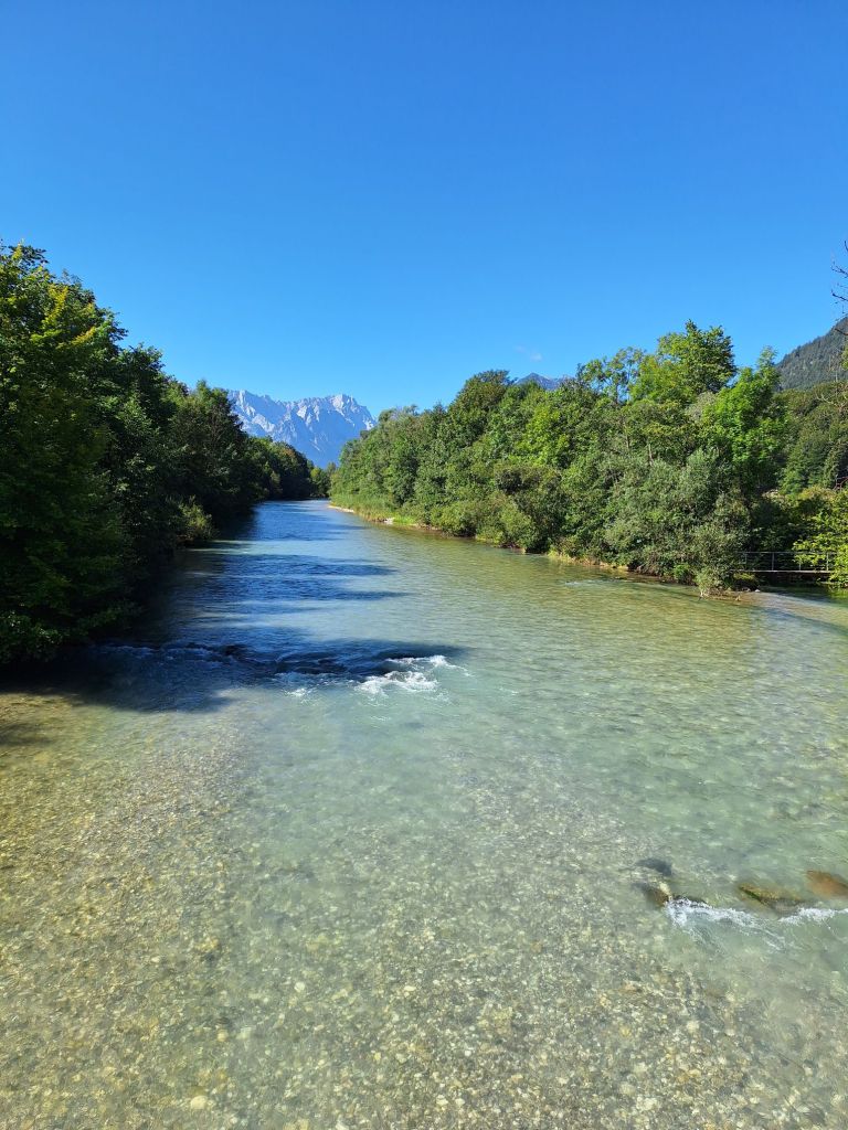 Die ersten Kilometer durch Ohlstadt und dann immer an der Loisach entlang Richtung Garmisch waren auch noch ebenes Genussradeln bei angenehmer Morgenluft. Die Zugspitze als Deutschlands höchster Berg präsentierte sich fast majestätisch hinter der Loisach. Nach kurzer Einkaufspause im Örtchen Farchant erreichten wir ca. 11:30 Uhr Garmisch, wo uns Komoot gottseidank abseits der wegen Samstag und Ferienzeit komplett überlaufenen Hauptstraße durch die Innenstadt leitete. Ein fast malerisches Vergnügen, ehe wir auch schon den Ort durchquert haben und es hinterher steil raufging parallel zur Bundesstraße.