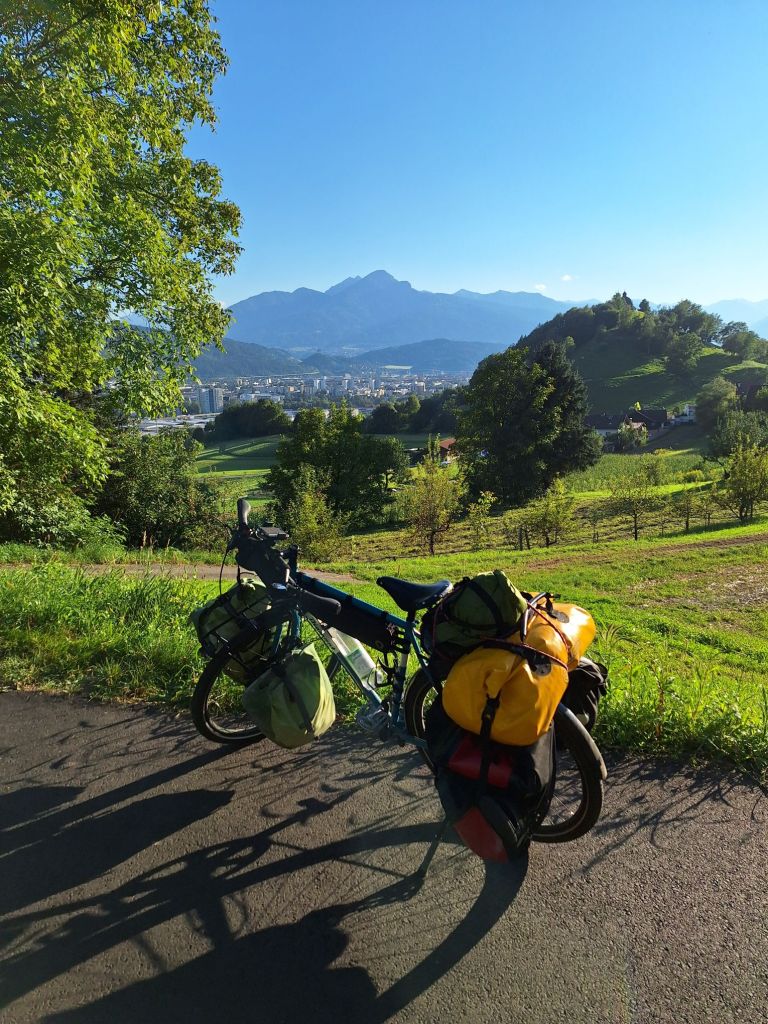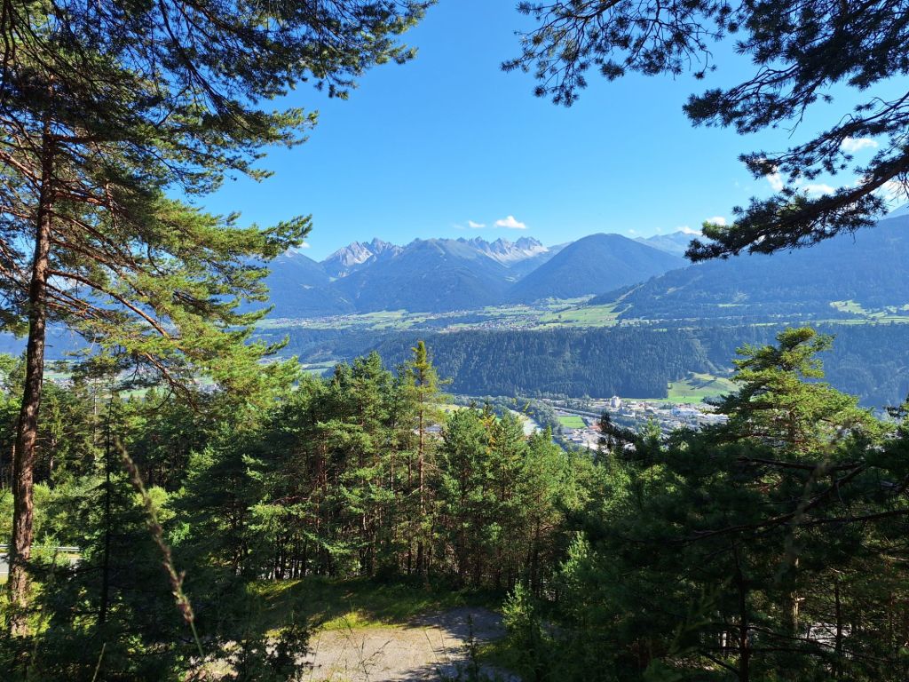Jannick war relativ zeitnah auch eingetroffen von seiner wohl nicht minder spektakulären Abfahrt durch Schotter, sodass wir uns alsbald an die letzten Kilometer am Inn machten. Es wehte ein böiger Ostwind. Auch das noch: Gegenwind auf den letzten Kilometern. Zudem mussten wir aufgrund von einer Baustelle am Innradweg einen kleinen Umweg über Völs fahren. Um ca. 18:15 Uhr war nach langem Tag mit viel Sonne und Wärme dann immerhin Innsbruck erreicht, wo ich mich von Jannick trennte. Er kann seinen Fokus nun voll auf seine Abschlusspräsentation legen. Meine Schlafgelegenheit war in Hoch-Rum verortet, wodurch ich durch Innsbruck durch und noch einmal 120 Höhenmeter den Berg hochmusste, die in steilen Passagen bei 90 Kilometern in den Beinen durchaus entkräftend waren. Der abendliche Ausblick über Innsbruck entschädigte immerhin etwas.