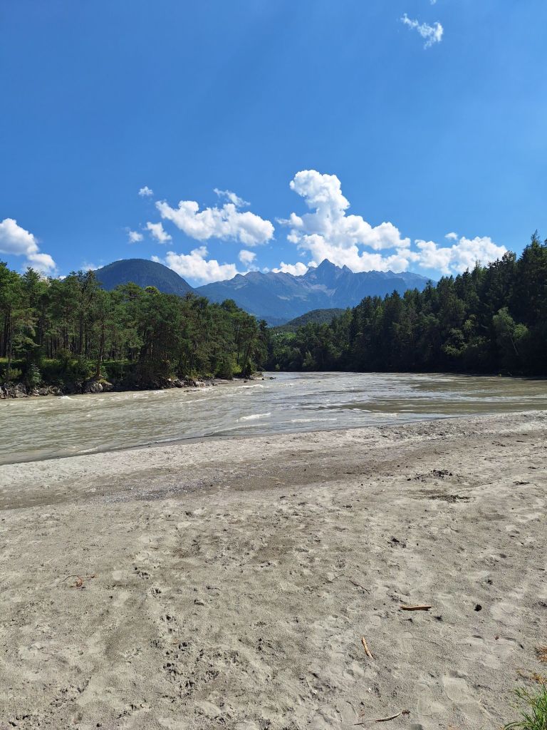 Am Inn entlang, der nun – wie vorher die Isar – die nächsten Tage unser steter Begleiter sein sollte, kamen schnell Kilometer zusammen. Raus aus Innsbruck, durch Zirl, Inzing und Hatting bis Telfs und weiter durch Silz und Mötz, stets mit der Bergkulisse von Karwendel und Mieminger Kette. Schnell waren wir schon in Haming und Roppen in der Mittagssonne wo pünktlich noch ein paar Gegenanstiege folgten. Durch den Pinienwald bei Roppen hatte es fast schon mediterranes Flair. So lang ist es ja nun doch nicht mehr, bis wir wieder am Meer sein werden. Doch mehr dazu im nächsten Blog.