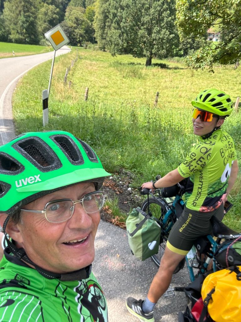 Wie dem auch sei – früh klingelte der Wecker, da mein Vater sich auf kurz nach 7 Uhr angemeldet hatte, um eine Etappe vom Herzen der bayerischen Landeshauptstadt Richtung Murnau am Staffelsee mitzufahren. Das Wetter war genial, sodass alle schnell und hochmotiviert aus den Federn kamen. Nach kurzen Packschwierigkeiten ging es gegen halb 8 in schöner, sonniger Morgenstimmung los, raus aus dem Stadtzentrum in Richtung Isartal. Komoot wollte uns weg von der Isar über den Perlacher Forst schicken. Mein Vater entgegnete: „Ich kenn mich aus – hier an der Isar ist es eh wunderschön und wir sparen Höhenmeter.“