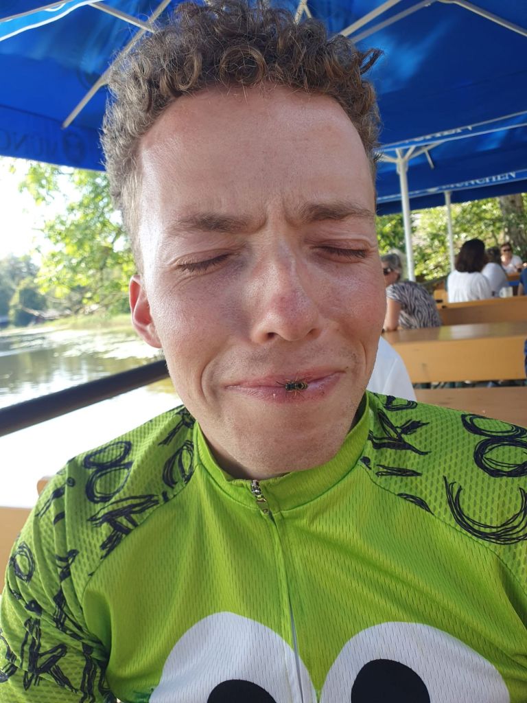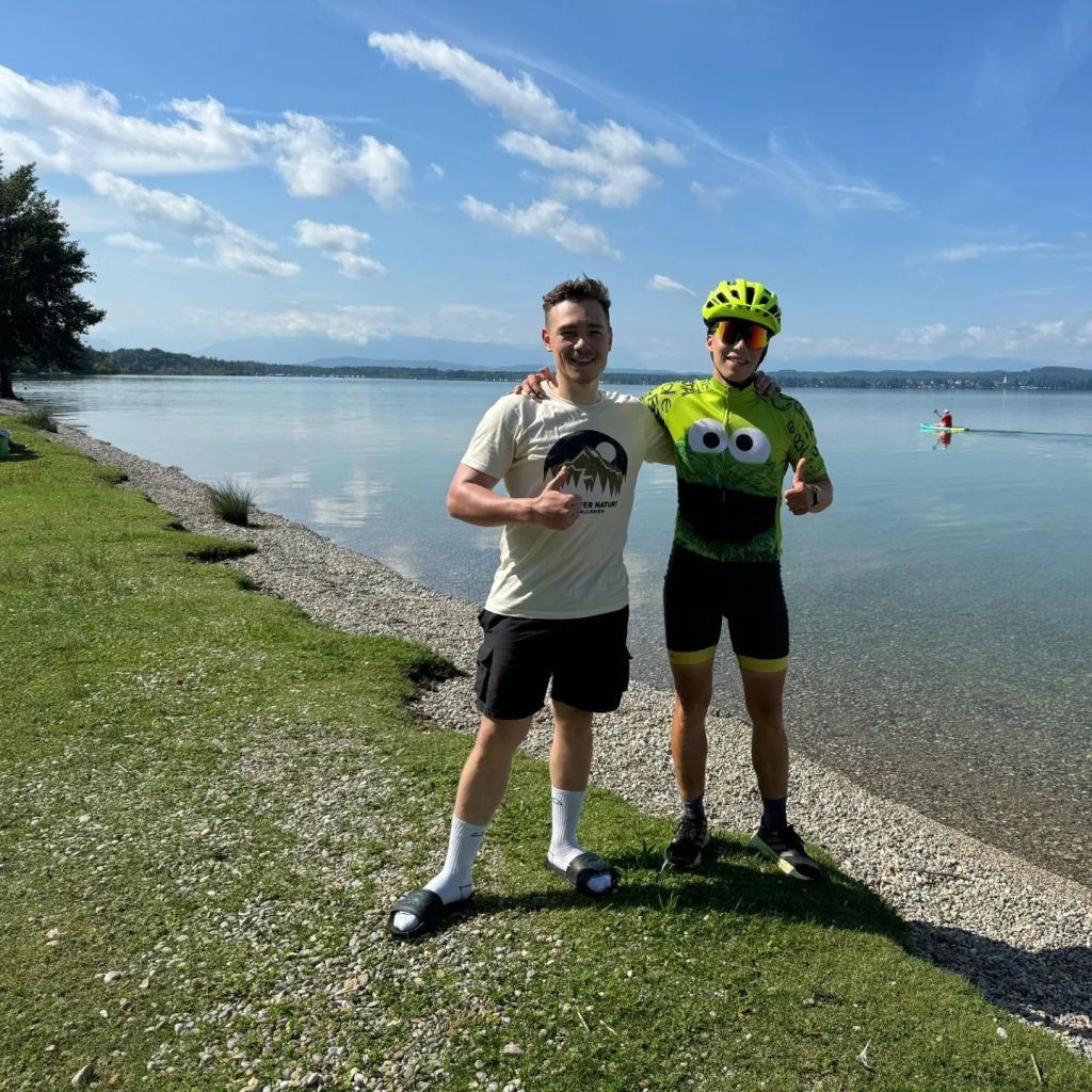 Die fehlenden drei Kilometer brachte Jannick auch mit lädiertem Fuß gut hinter sich, bis wir am Biergarten „Alpenblick“ in Uffing am Staffelsee eintrudelten nach ca. 70 Kilometern. Wie passend nach dem ersten Alpenblick auf der heutigen Tour. Ein Sprung in den Staffelsee und ein schmackhaftes Russ entschädigten für die Anstrengung – wenn so manche Plagegeister nicht auch Durst gehabt hätten 😉