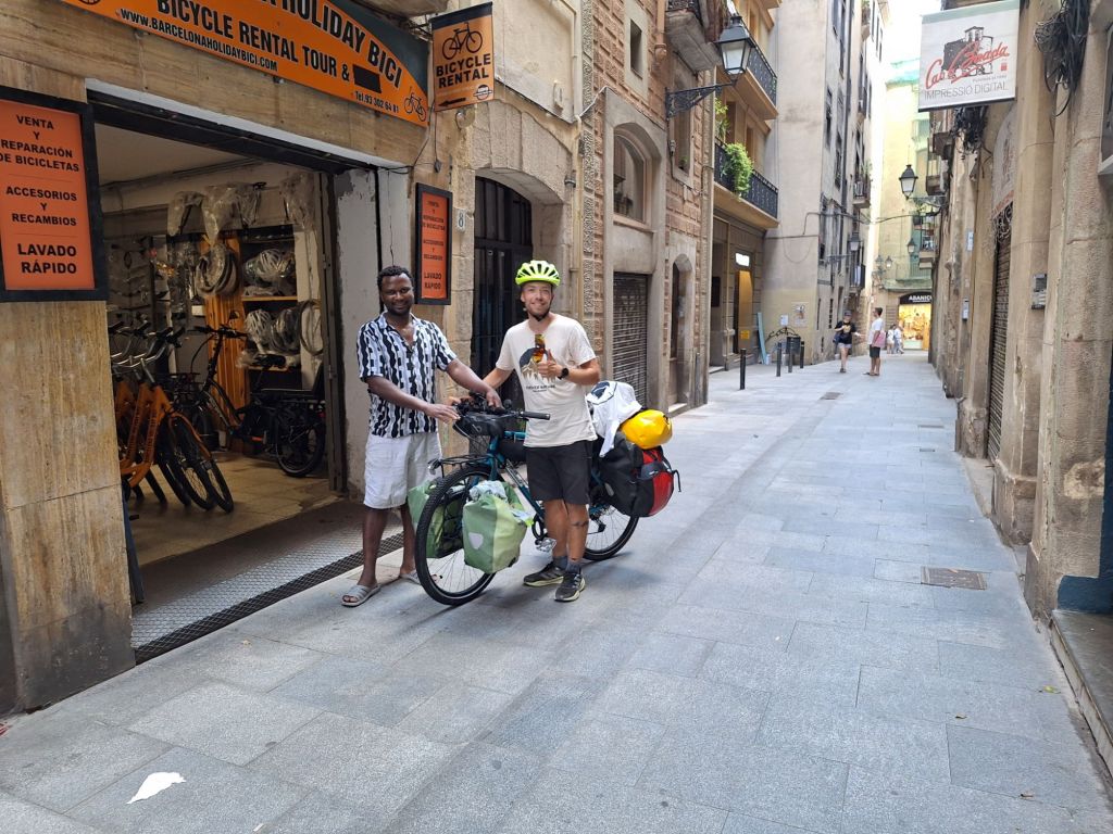 Ich musste nach Erledigung noch einige Zeit auf Jannick warten. Er hatte mal wieder einen Platten, bereits sein Vierter! Der Typ hat ein Pech hey! Diesmal nicht auf Felgenseite, es war wohl ein Loch im Mantel, wodurch ein Fremdkörper eingedrungen ist. Zudem hat sein Hinterrad Spiel bekommen und er hat zwar viel Werkzeug dabei, aber nicht jenes, um die Schrauben hierfür wieder festzumachen. Von Hand machte er sie so fest wie möglich, was notdürftig bis Barcelona klappte. Aber hilft nichts – es ist wohl vernünftig, wenn er auch einmal zu meinem nigerianischen Helfer geht – übrigens mit super Preis-Leistungsverhältnis: Für zwei Stunden Wartung mit allen Komponenten, Austausch der Kette, Komplettreinigung und Reparatur vom Licht zahlte ich 70 Euro.