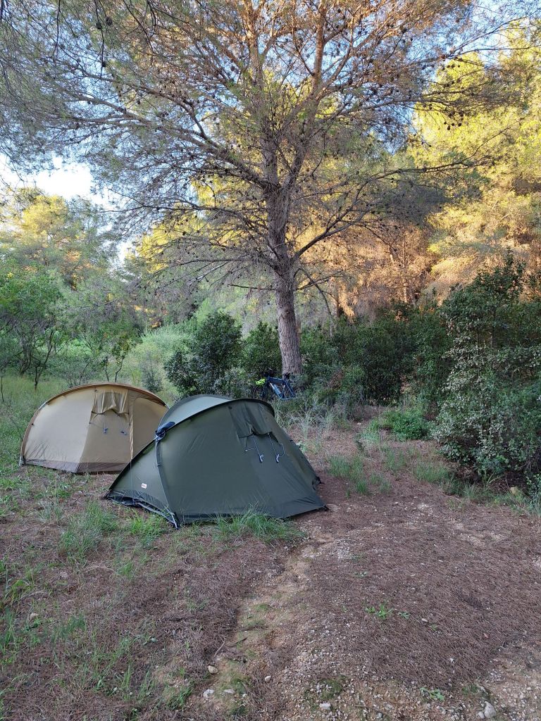 Nach insgesamt nur einer Snackpause und einer Lidlpause, um nochmal Proviant zu holen, waren wir um 18:30 Uhr schließlich an dem mit vielen Bänken, Trinkwasserspendern und Mülltonnen gespickten Platz. Ebenso lag trotz Entsorgungsmöglichkeiten reichlich Müll herum – unverständlich für mich. Hinter dem großen Platz war eine Böschung, hinter welcher wiederum ein Wanderweg begann. Lief man diesen 50 Meter runter, so war hinter der ersten Kurve eine versteckte, ebene Fläche im Pinienwald, wo außerdem kein Müll herumlag.