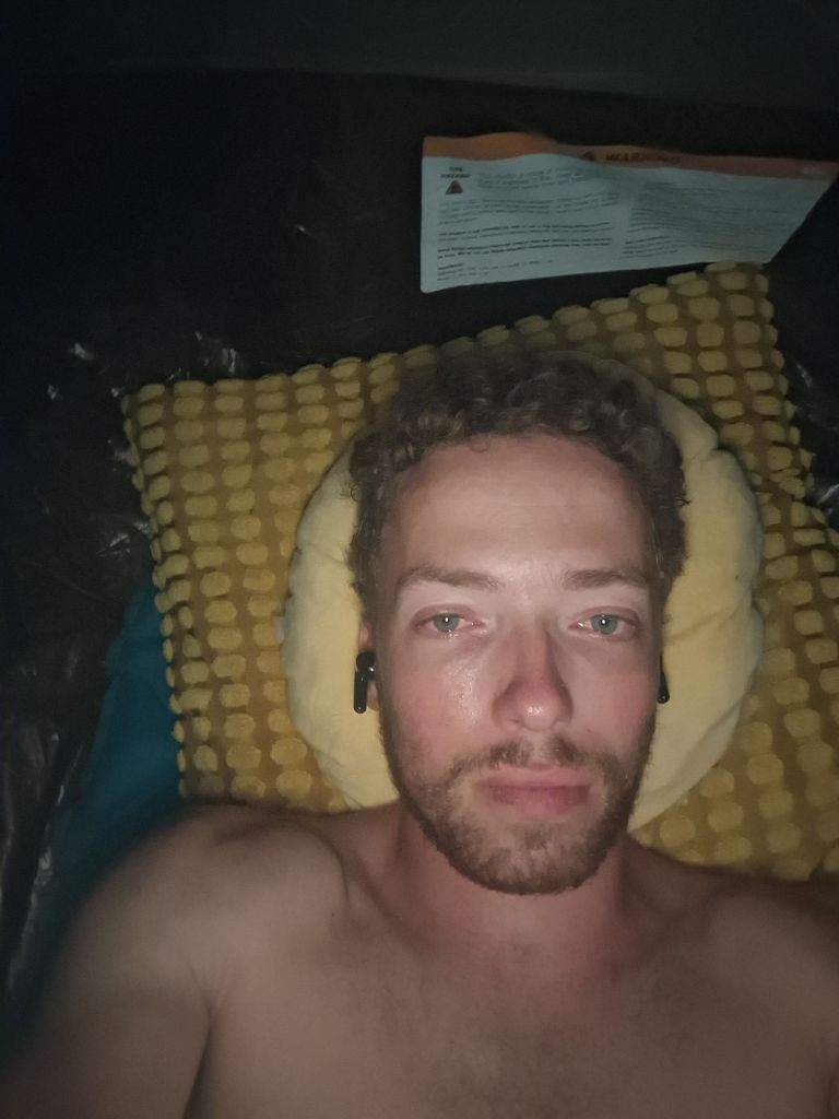 Ich entschied spontan, diesen Spot zum Zeltaustellen zu verwenden und zog um. Jannick folgte alsbald. Für Zeltaufbau und Kochen von Nudeln kochen reichte die Zeit noch, alsbald wurde es dunkel, sodass alsbald das Bett bzw. die Luftmatratze rief. Auch ich war sehr müde nach dem ereignisreichen und leicht stressigen Tag. Meinen glasigen Augen merkte man es beim abendlichen Musikhören im Zelt zur Entspannung an: