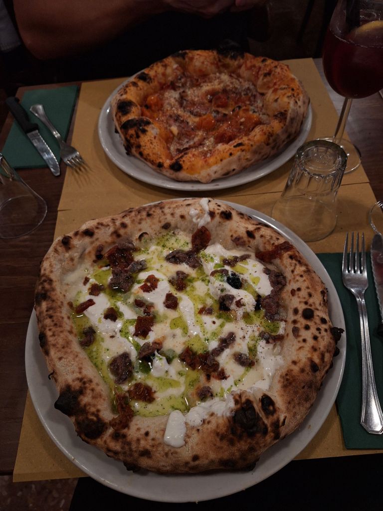 Ein kleiner Einwurf noch zum Thema Kulinarik: Wir ließen es uns nicht entgehen, die beste Pizzeria Spaniens zu besuchen: „Trattoria Popolare“. Außerdem ausgezeichnet als Platz 2 in Europa. Die Erwartungen waren dementsprechend hoch. Kurz gesagt: Sie wurden nicht enttäuscht. Meine Pizza „Vacanze ad amalfi“ mit Pesto, Stracciatella, Mozzarella und Oliven (vielleicht nicht Jedermanns Sache) bestach durch fluffigen Pizzarand durch die neapolitanisch Art und ein unvergleichliches Geschmackserlebnis. Eine der besten, wenn nicht gar die beste Pizza, die ich je gegessen habe. Etwas schade war die Massenanfertigung, mit der die Betreiber der hohen Nachfrage gerecht werden wollten. Reservieren konnte man seinen Tisch nur für einen 1,5-Stunden-Slot, worunter natürlich ein wenig die Gemütlichkeit leidet.