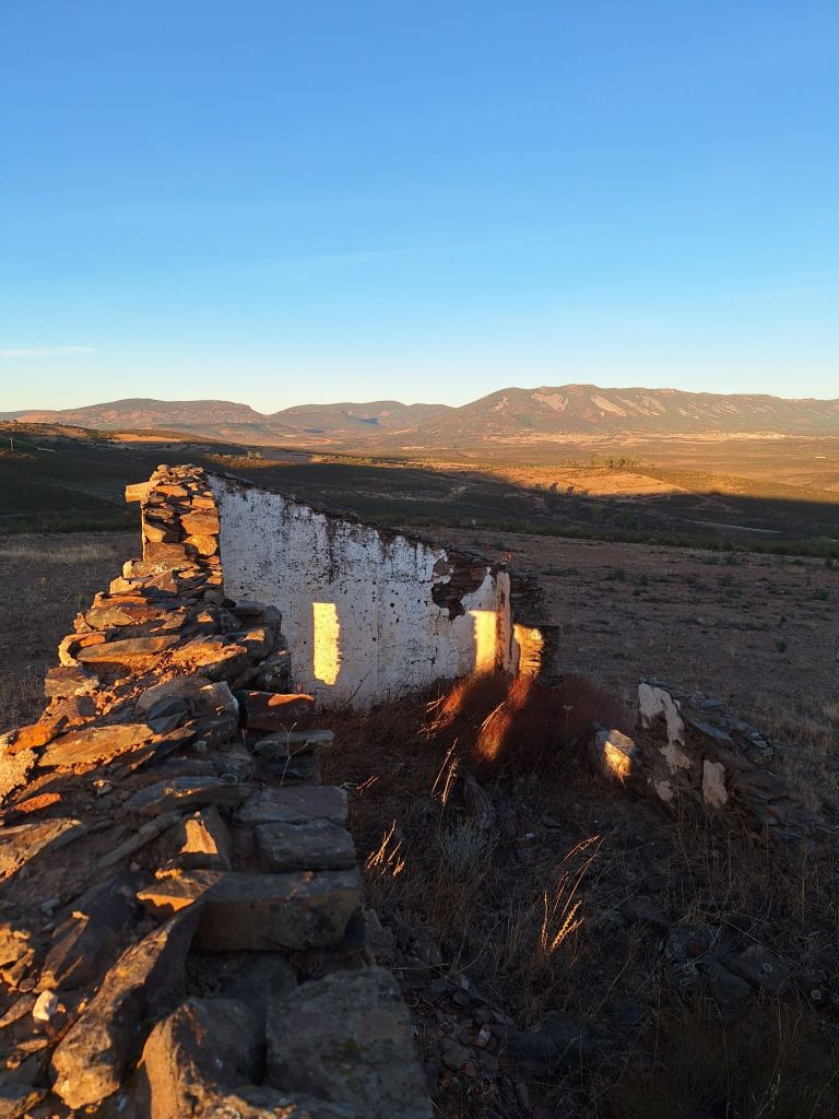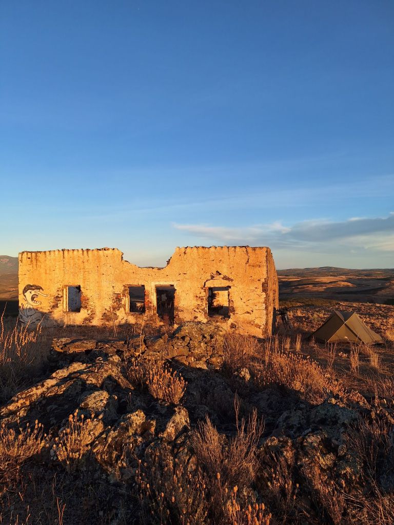 So fuhr ich erstmal aus dem Ort wieder raus, um nach einem Schlafplatz zu suchen. Nach einigen erneuten Höhenmetern fiel mir eine Ruine 100 Meter neben der Straße auf, mit toller Rundumsicht in die hügelige Landschaft – wenn auch relativ freistehend und angrenzend an Privatgelände.
