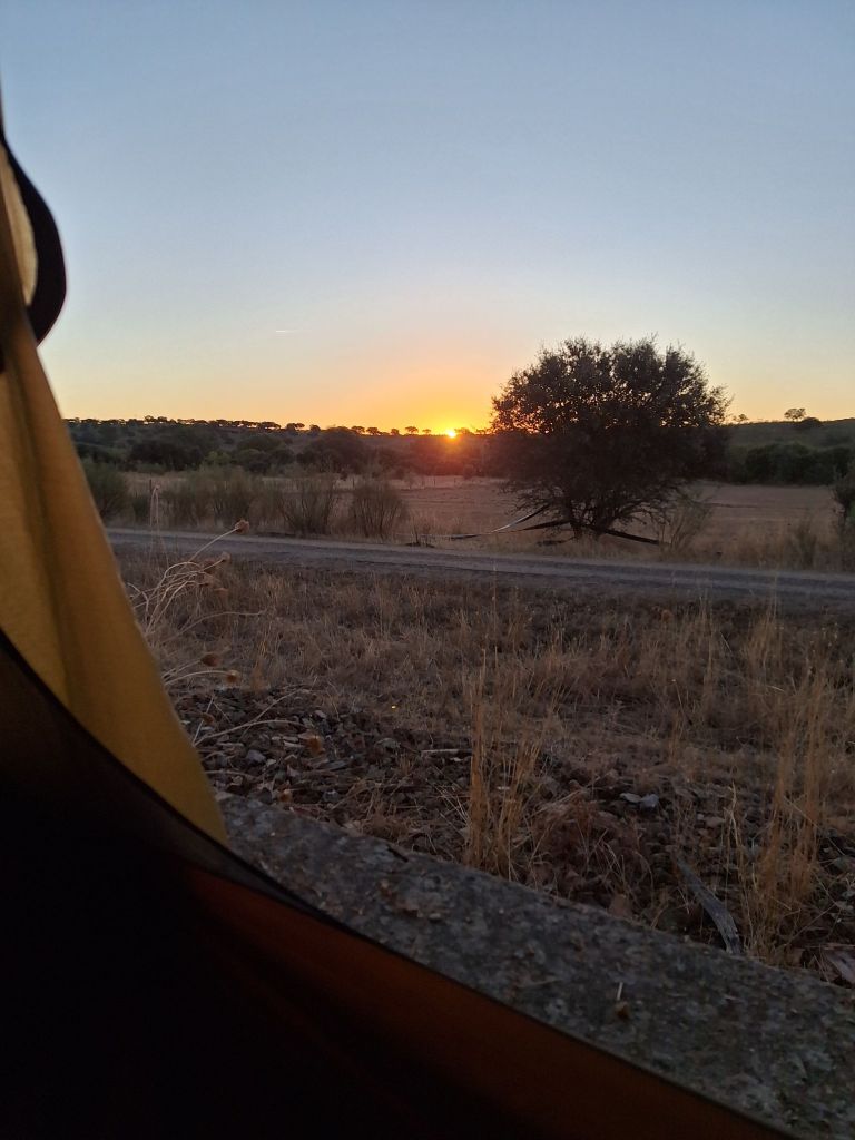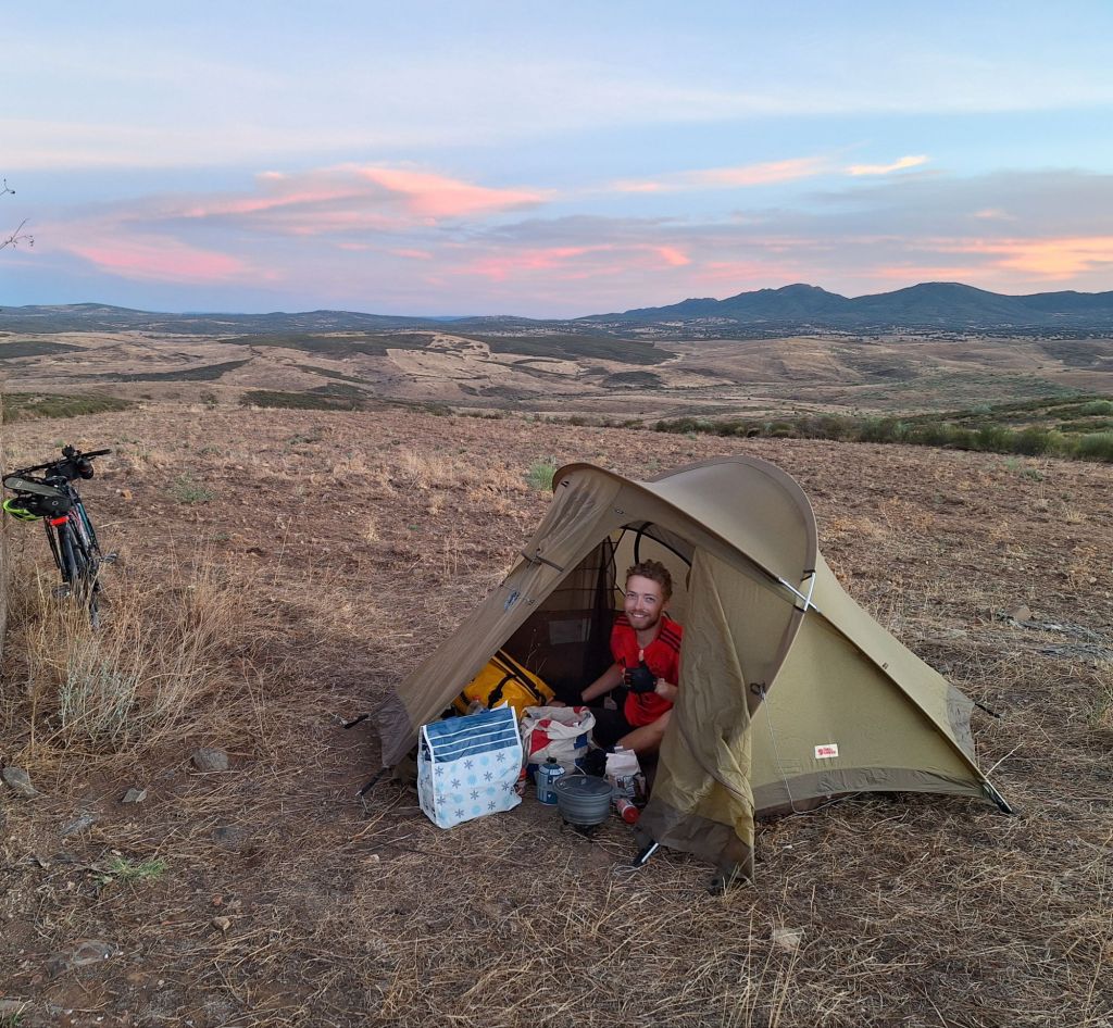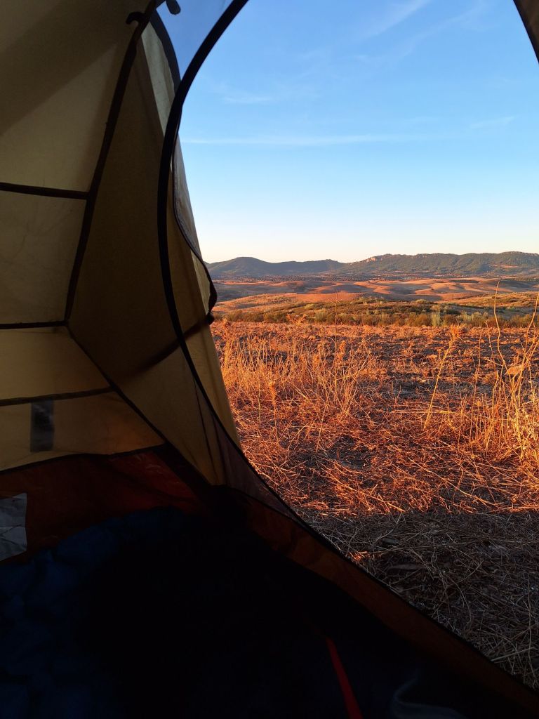 Wir kamen ins Gespräch auf Englisch, das erste Mal seit Ewigkeiten, dass ich mich so problemlos unterhalten konnte. Er war tief beeindruckt von dem Vorhaben: „You are such an inspiration, man!“ Auch erzählte er mir, wie sehr er das Landleben in Spanien genießt im Vergleich zu seiner Vergangenheit im vereinigten Königreich. Dank ihm bekam ich noch ein schönes Foto mit Zelt an dieser tollen Location, ehe wir uns mit besten Wünschen verabschiedeten. Ein schöner Tagesausklang! Nebenbei wurde noch mein letztes Glas Pesto zu den Nudeln verkocht und in der Dunkelheit schließlich verschlungen…