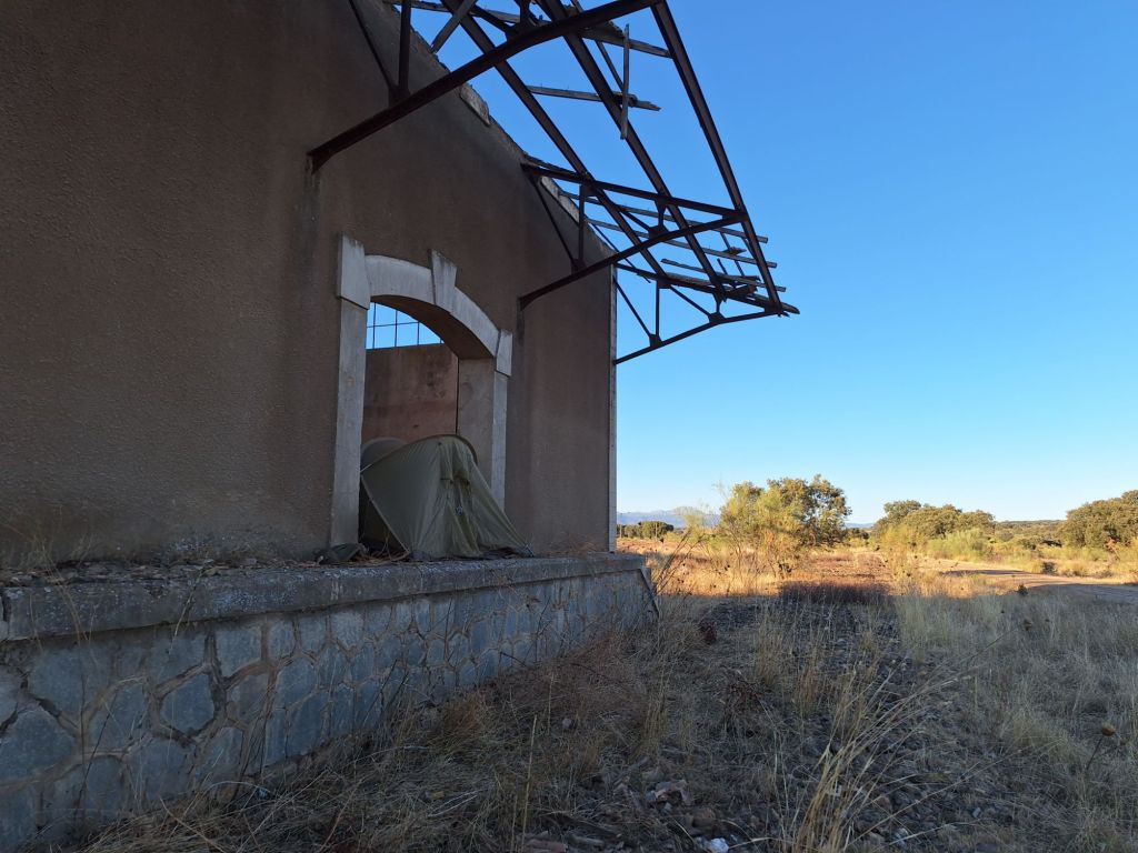 Nach etwas über 10 Kilometern einwärts in die Pampa entdeckte ich ein verlassenenes Bahnhofsgebäude. Kurz überlegte ich, dann fiel der Entschluss: Egal, hier bau ich das Zelt auf. Und mal schauen, vielleicht komme ich ja irgendwie an Wasser. Der Flusslauf soll laut Karte ganz in der Nähe sein. Und 76 Kilometer mit 1.200 Höhenmetern sollten für heute echt genug sein – besonders in meinem müden Zustand. Von hier aus sind es noch flache 92 Kilometer bis Merida, der nächsten Stadt, wo wir ja auch eine Unterkunft über einen Warmshowers-Host haben – sollte schon irgendwie machbar sein morgen!