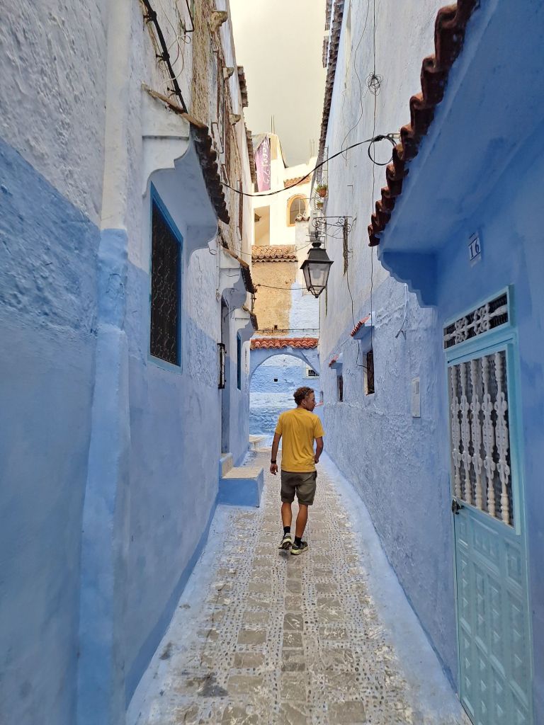 Schwamm drüber – Laurin und ich verstauten unsere Räder im Abstellraum des ebenso blau gestalteten Hostels, checkten ein und machten einen ersten Spaziergang durch Chefchaouen – die engen, blauen Gassen haben durchaus ihren „Vibe“. Auf dem Hauptplatz tummeln sich derweil die Touristen in den Restaurants. Die Altstadt ist ein einziger großer Markt. Restaurants, Imbissbuden und Läden reihten sich nur so aneinander. Schnell wurden bei dem Spaziergang und entsprechenden Preisen die am Berg gelassenen Kalorien auch wieder reingeholt.