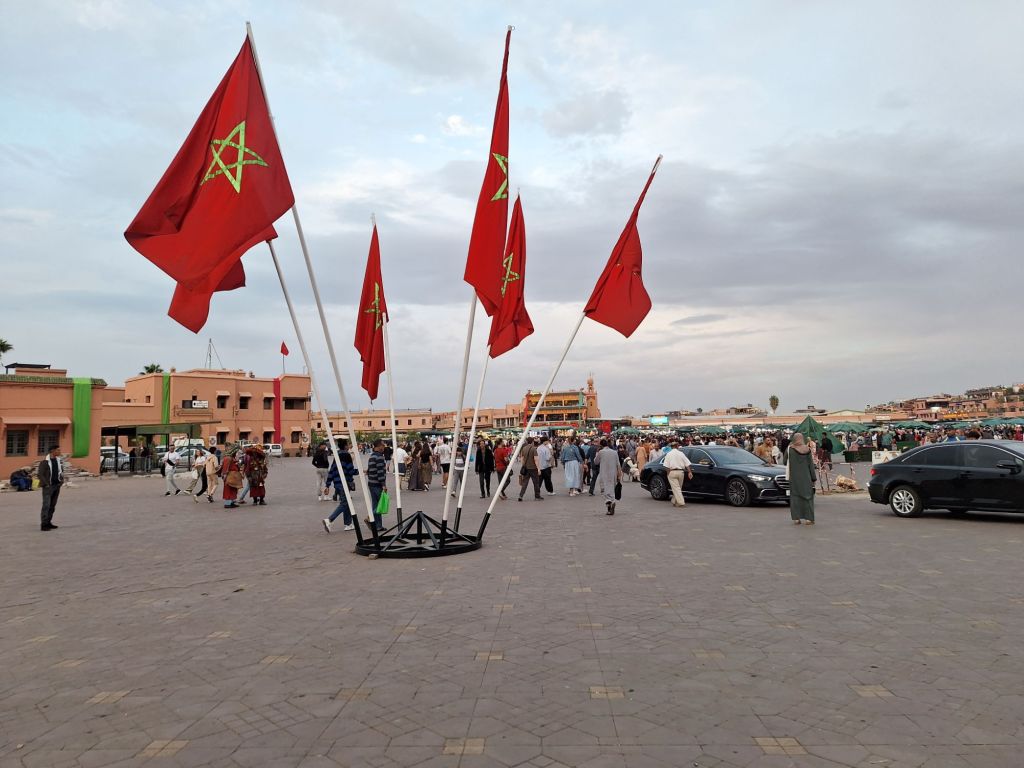 Nach Erholungspause mitsamt Tee auf der Hostelterasse und einer kleinen Mahlzeit (es sollte nicht die letzte bleiben) wurde die Erkundung Marrakeschs gestartet. Vom Hostel etwas südlich des Zentrums wurde sich direkt in den chaotischen Verkehr Marrakeschs gestürzt – einmal waghalsig über die komplett wilde Hauptstraße direkt in die Fußgängerzone zum berühmten Place Jemaa el fna.