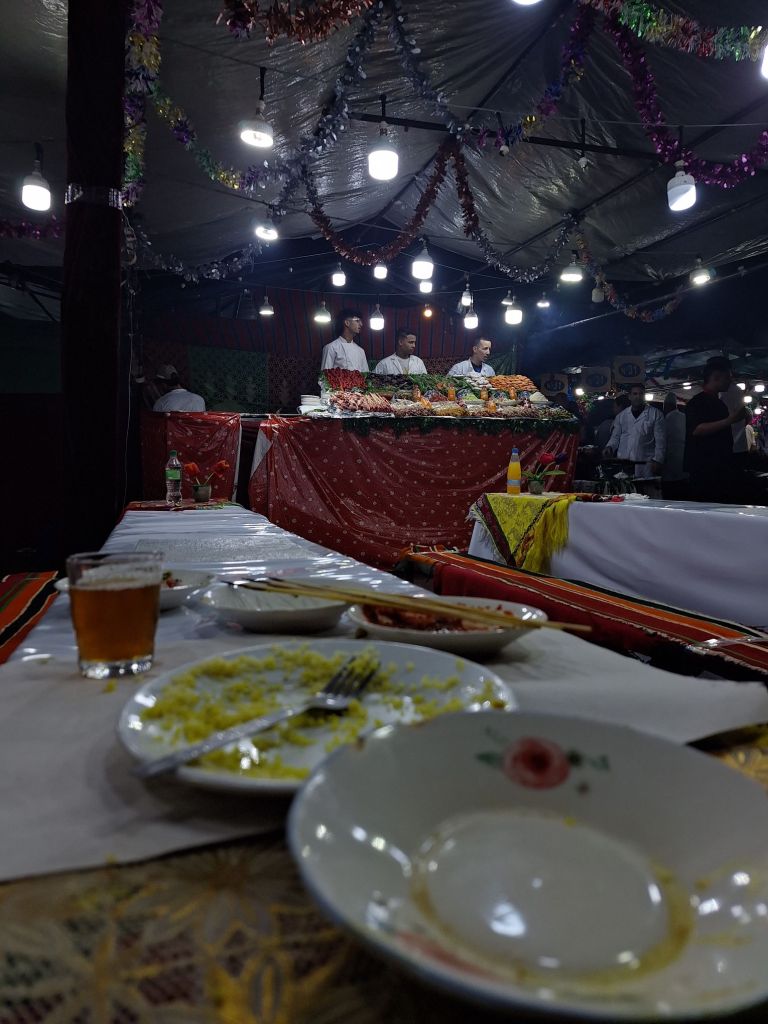 Zurück am Platz nach Sonnenuntergang verwandelte sich dieser wahrhaft in eine Kirmis mit zahlreichen Ständen, unter anderem auch Flaschenangeln. Irgendwann gab ich der Bedrängnis zahlreicher Verkäufer nach und gönnte mir bei einem Stand ein reichhaltiges Abendessen mit vollem Kulinarikprogramm von marrokanischem Salat über Hähnchenspieße hin zu Gemüse-Couscous und natürlich einem Tee.