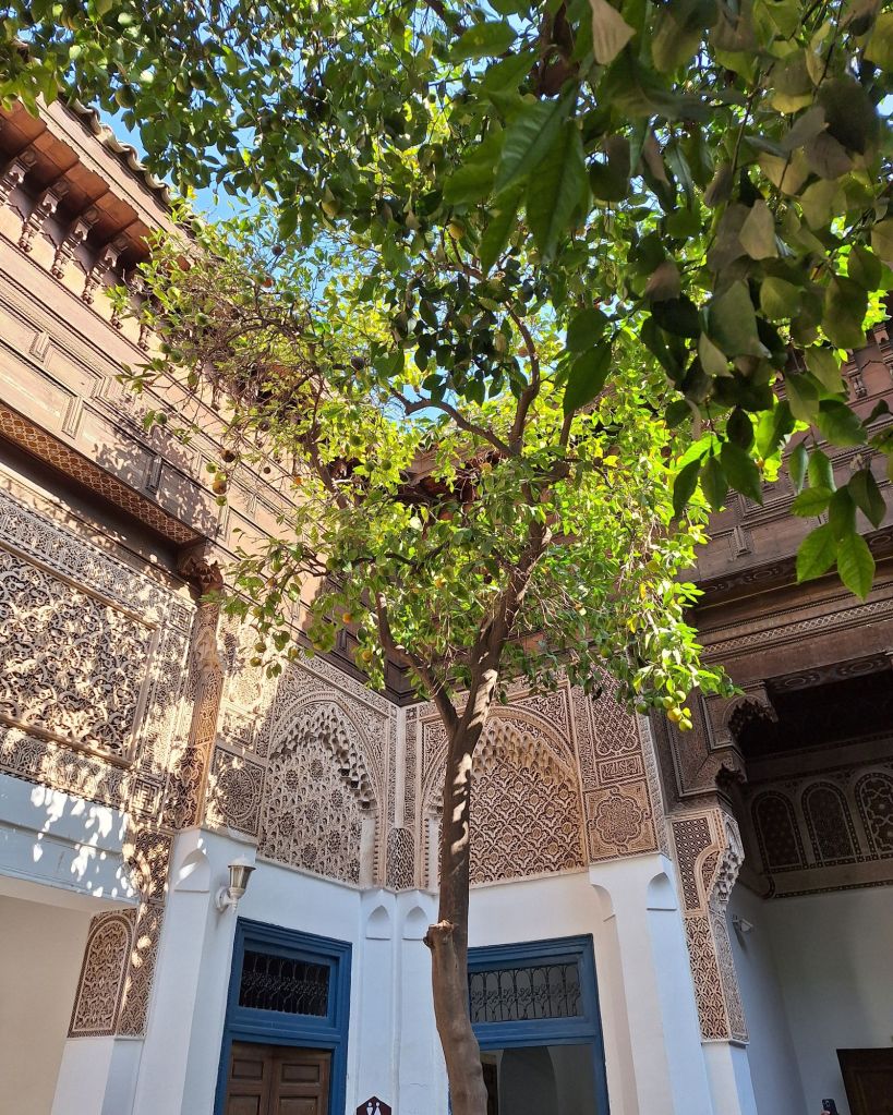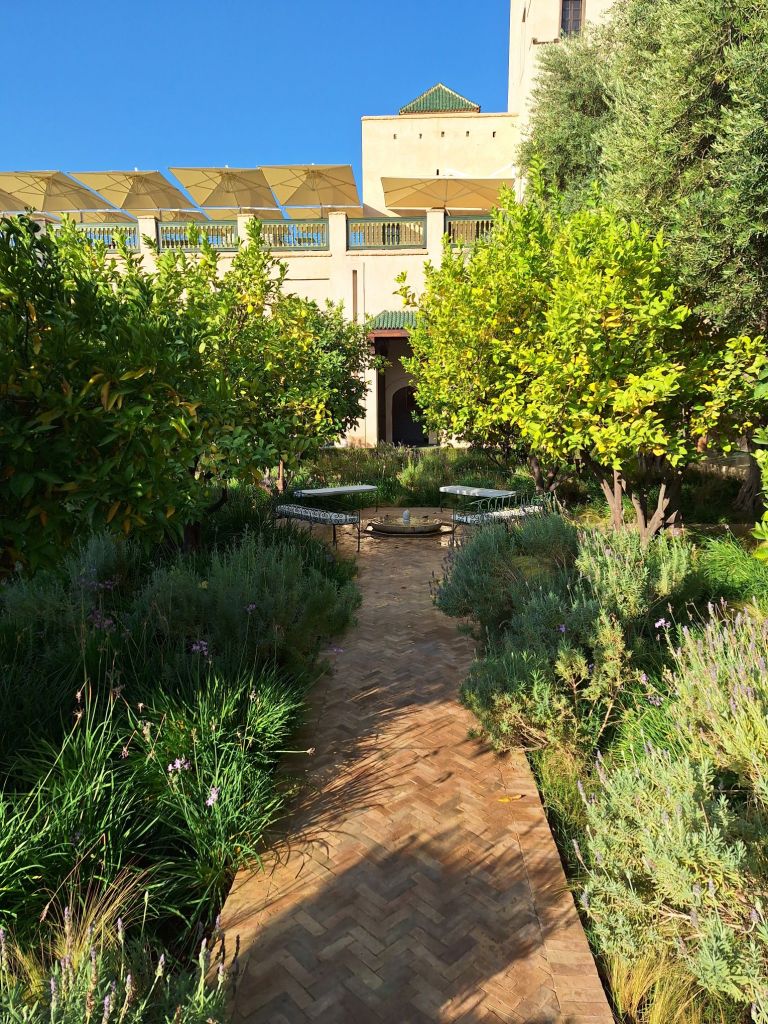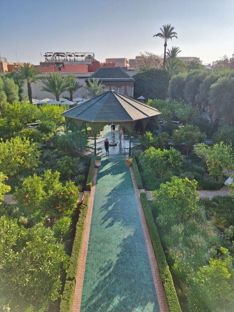 Nach Zahlung des Eintritts in den Jardin Secret eröffnete sich dann tatsächlich ein kompletter Kontrast. Ein grüner Garten mit Pavillions und Brunnen in der Mitte, voller Ruhe und Natur – zumindest zu früher Tageszeit auch ohne viele Menschen. Diese Brunnen haben eine zentrale Bedeutung für den Garten, da das Wasser in Marrakesch eine knappe Ressource war und ist. So wurde vor etwa 1.000 Jahren ein hydraulisches System von unterirdischen Kanälen entwickelt, um das Wasser aus dem umliegenden Atlasgebirge in die Stadt zu leiten. Durch dieses System funktioniert auch heute noch die Wasserversorgung, daher der Name „der geheimnisvolle Garten“.