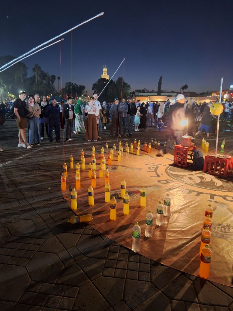 Nach dem Spaziergang zurück kam ich pünktlich zum Sonnenuntergang wieder am Place Jemaa el fna an. Ich wollte noch einmal die Atmosphäre hier genießen nach Sonnenuntergang, ließ mich sogar einmal zum Flaschenangeln überreden. Es war jedoch zum Verzweifeln: Ich muss oftmals knapp dran gewesen sein, eine Flasche Softdrink konnte ich jedoch trotz viel Geduld nicht ergattern.