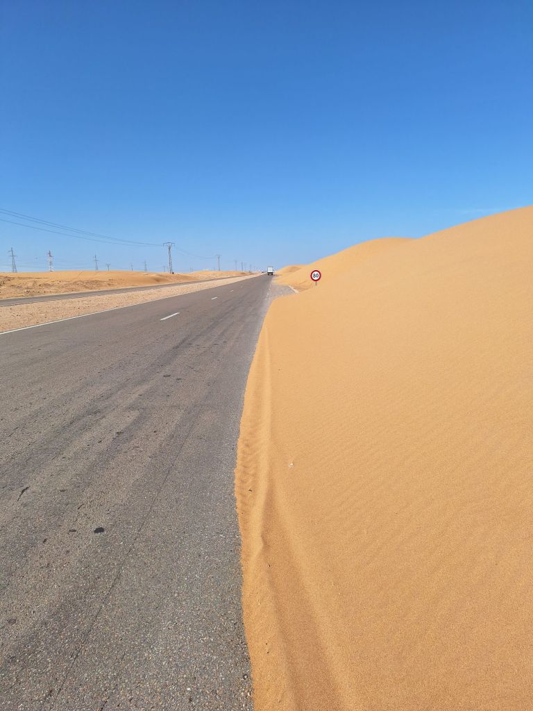 Nach dem Kauf von Snacks erblickte ich am Straßenrand ein Schild, das vor Sand auf der Straße warnte. Direkt hinter Laayoune erkannte ich den Grund: Mächtige Sandwehen in Form von Dünen türmten sich direkt neben der Straße auf! Vergesst Schneewehen, Sand ist nochmal imposanter!