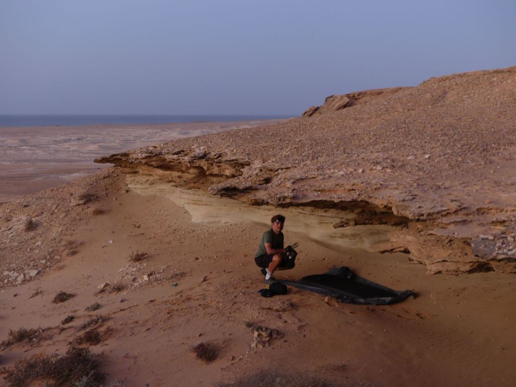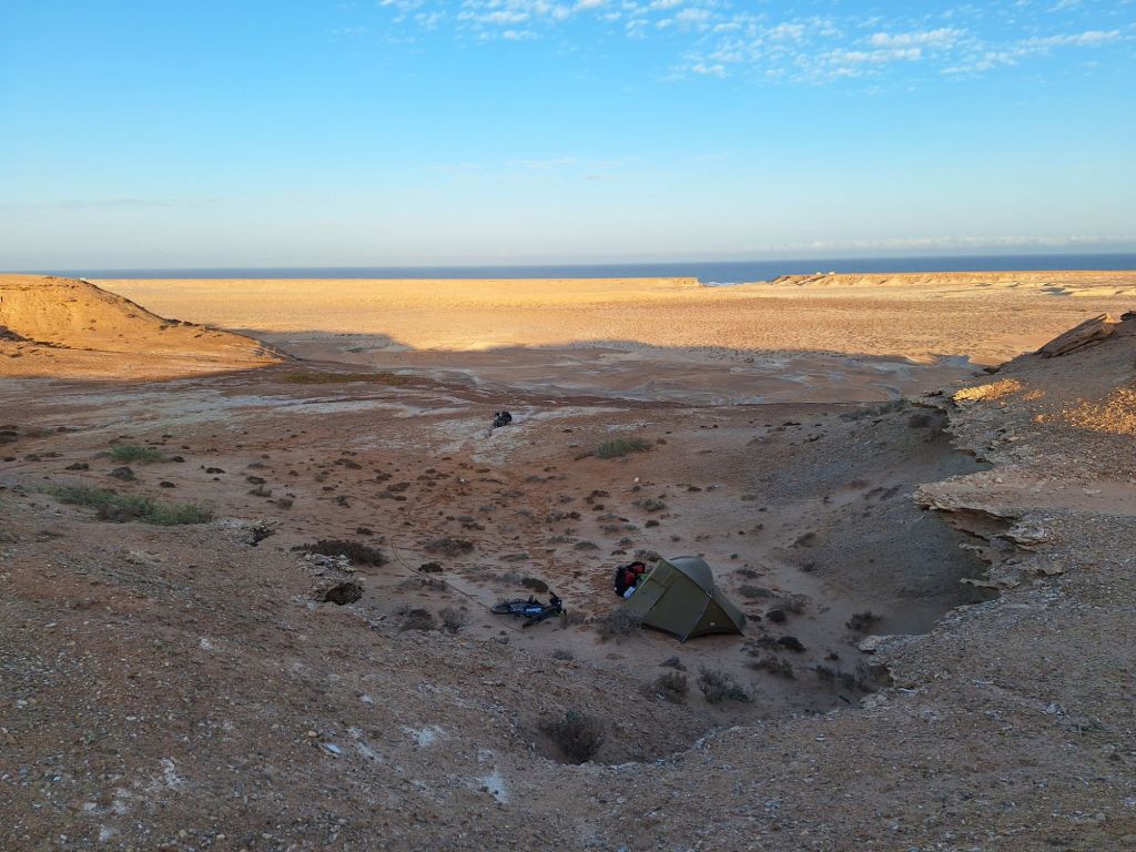 Mit dem immer besser werdenden Wind waren wir schließlich um 18:30 Uhr bei fast 95 Kilometern – da Christel und Lucas jedoch noch aufholen mussten, gingen Jannick und ich nun zur Platzsuche über. Relativ schnell tat sich bei einem Streckenabschnitt nahe an der Küste eine Möglichkeit auf, hinter einer Klippe auf einer Art sandigen Hochebene über dem Meer zu schlafen.