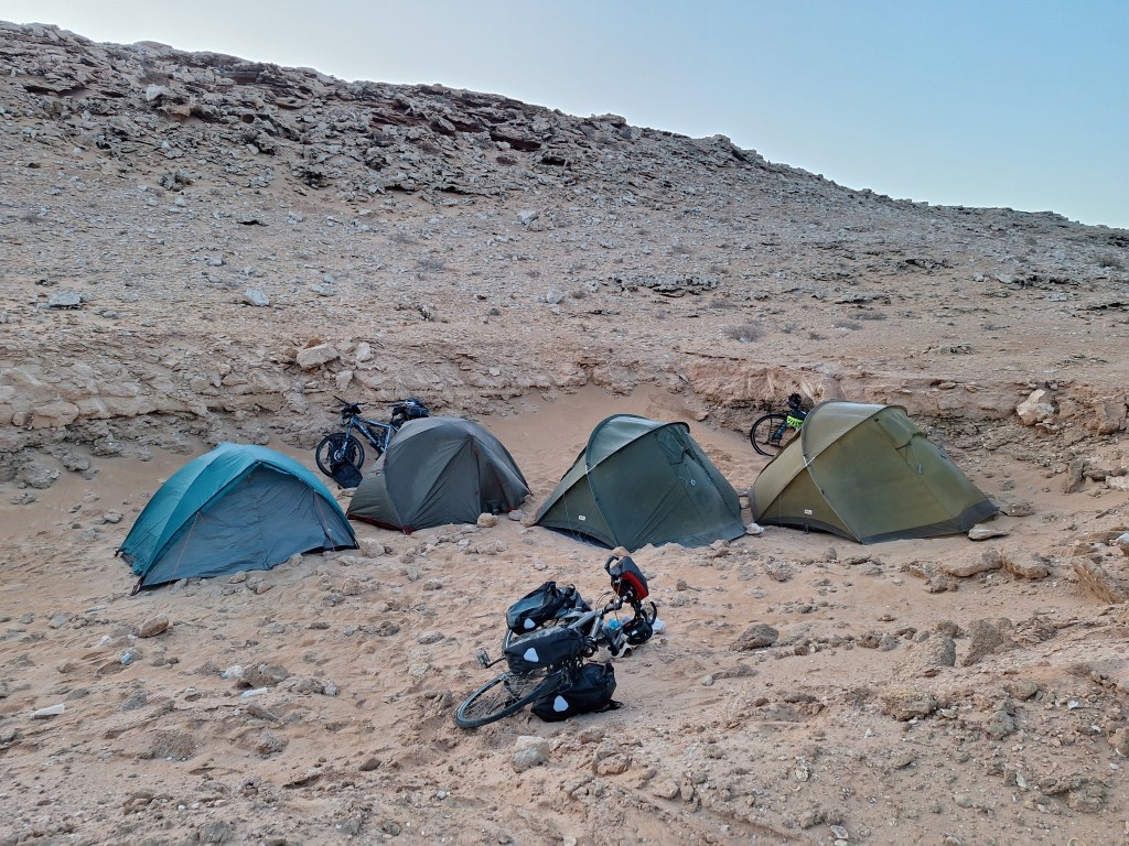 Wenig später trudelte der Rest ein – hier wurde dann tatkräftig geholfen und Zelte festgehalten, die sonst wohl vom Winde der Sahara verweht worden wären. Beim Verstauen von Proviant wurde zudem stets Sand ins Innere der Zelte geweht, die einem wahren Sandkasten glichen.