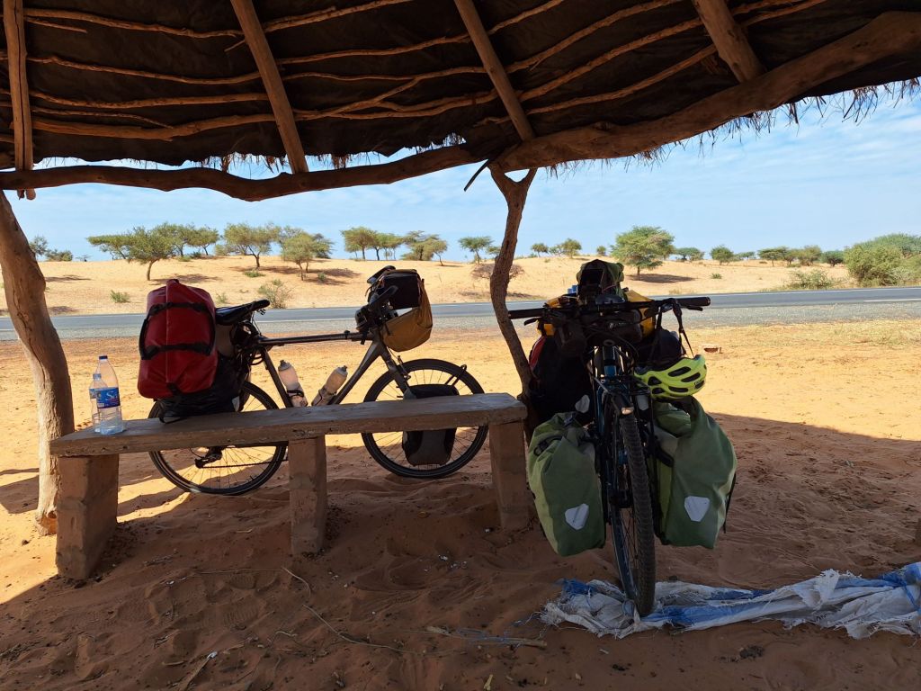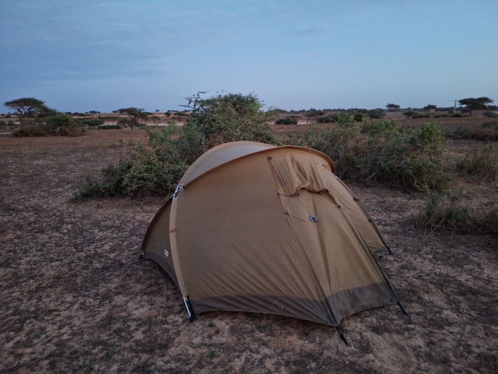 Als wir an dem nächsten größeren Ort, Darou Fal, ankamen, war der Sonnenuntergang bereits nicht mehr fern. In dem Ort herrschte auf schlagartig extrem schlechter Fahrbahn reges Treiben, vier Kilometer quetschten wir uns an Autos, Menschen und Schlaglöchern vorbei, ehe es wieder ruhiger wurde. Wo schlafen? Es wird langsam dunkel. Als wir schließlich ein ein Feld mit Bäumen und Büschen, hinter denen man sich verstecken kann, sahen, wählten wir diese Notfalllösung: Einfach hier schnell runter und querfeldein 200 Meter weg von der Straße irgendwo schlafen. Tierkot war hier zumindest nicht ersichtlich, sollte also schon klargehen…