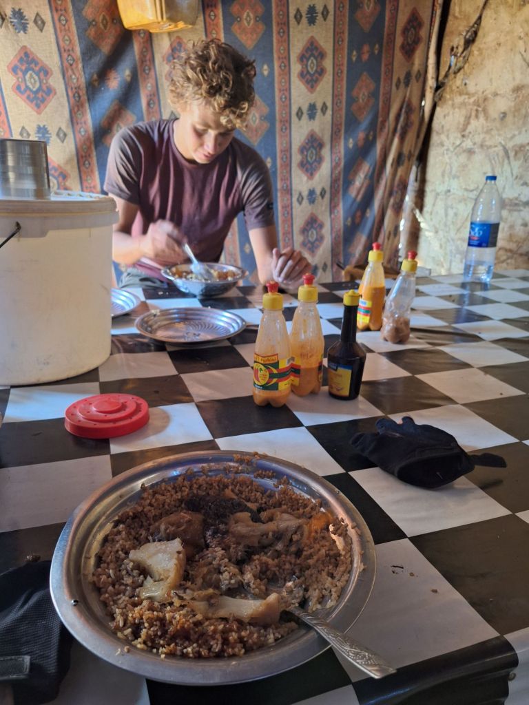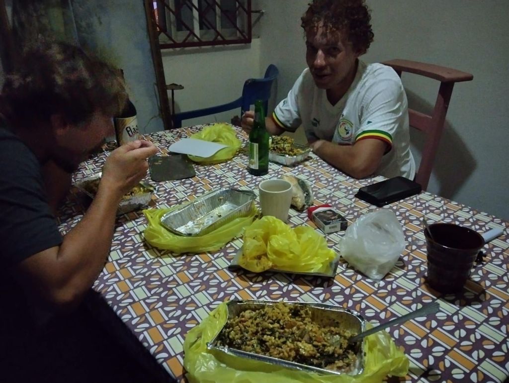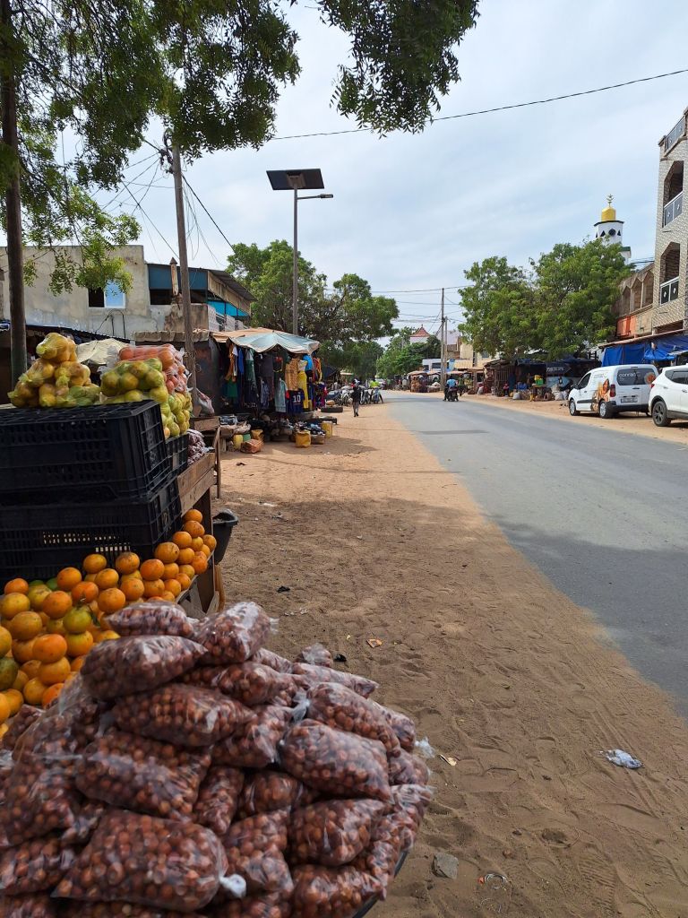 Stattdessen fanden wir auf Nachfrage schnell einen Stand am Markt des Ortes, wo man uns auch am fortgeschrittenen Nachmittag noch ein Essen zubereiten konnte. Es gab Thieboudienne, das senegalesische Nationalgericht, auf Wolof: „Fisch mit Reis“. Apropos Wolof: Aufgrund der senegalesischen Hauptsprache neben Französisch birgt die Kommunikation auf Französisch hier immer mal wieder Schwierigkeiten, da die Einheimischen häufig zu Wolof wechseln, wenn sie mit einem auf Französisch kommunizieren möchten.