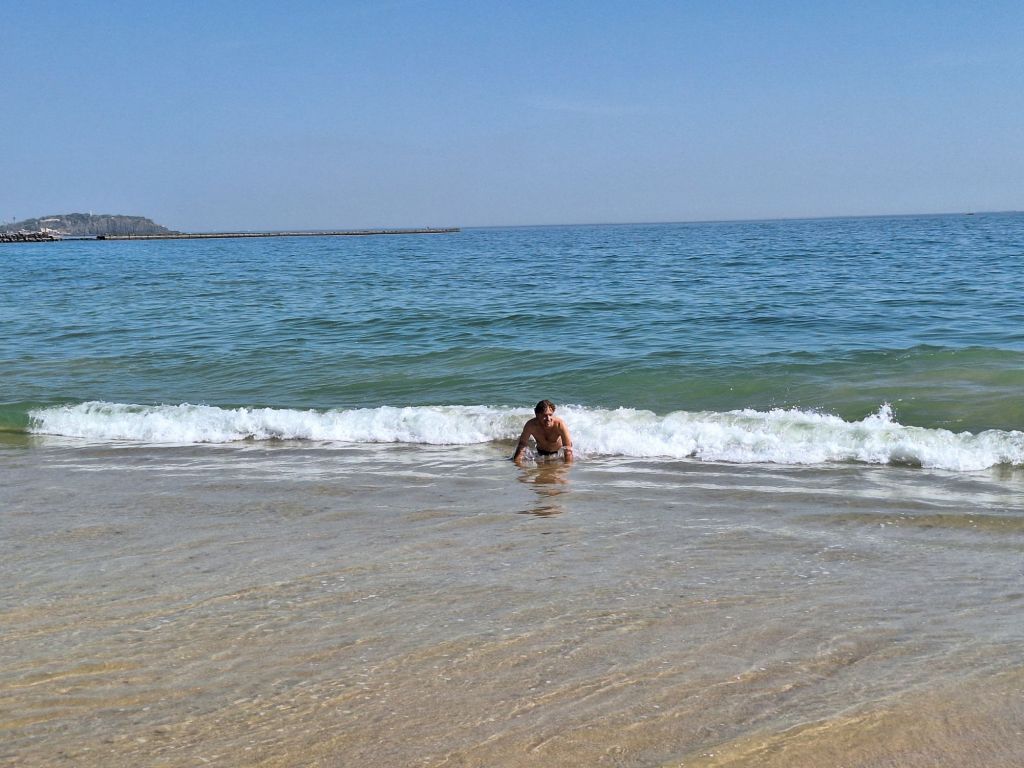 Der Platz hätte sich mit seinen schattigen Grünflächen auch gut für eine Pause angeboten, doch leider war alles besetzt, sodass wir unseren Spaziergang weiter fortsetzten in Richtung Küste. Direkt ums Eck vom Hafen fanden wir einen fast unbehelligten, ruhigen und sauberen Strand. Wir machten hier dann dafür ausgiebig Pause und erfrischten uns im einladenden Atlantik.