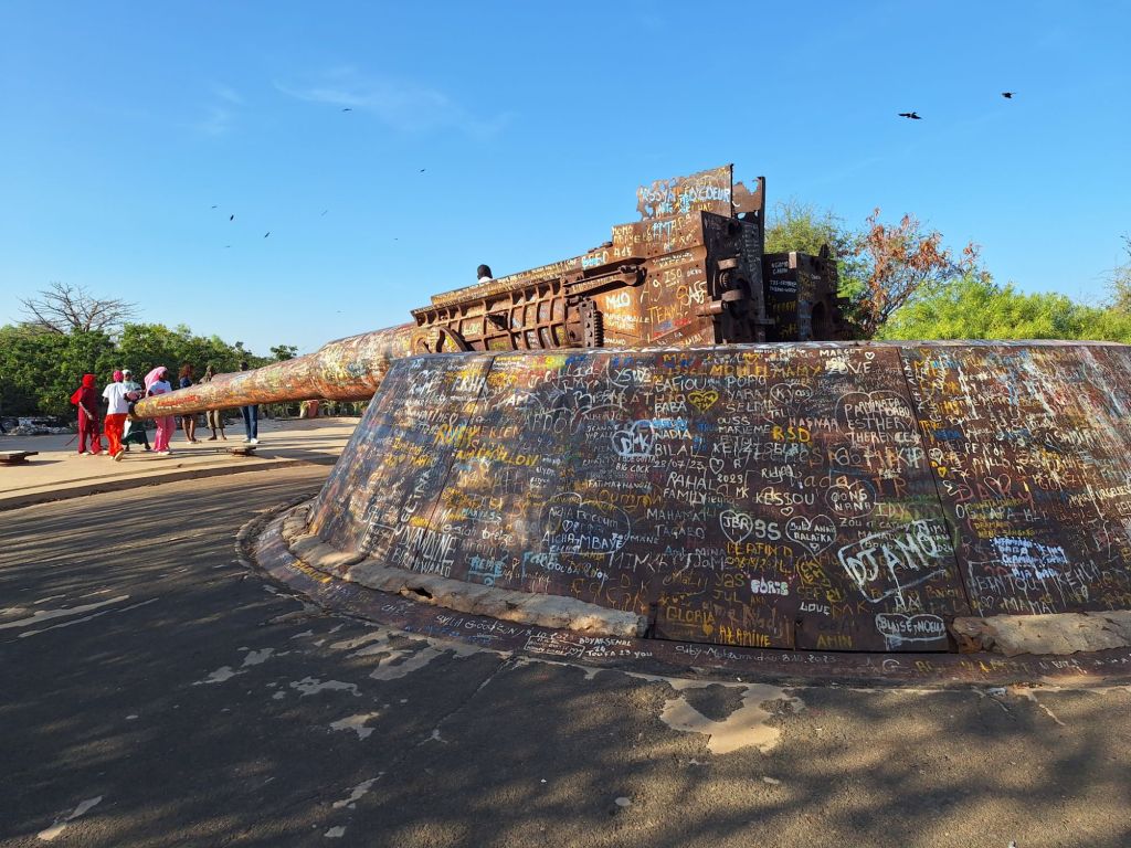 Nach dem Sklavenhaus besuchten wir auf dem Hügel der doch sehr touristischen Insel das Denkmal Gorée-Alamadies als Symbol für den Kampf gegen die Sklaverei. Direkt daneben steht eine Kanone aus Weltkriegszeiten. Sie wird „Kanone von Navronne“ genannt, da genau an diesem Ort Dreharbeiten für den gleichnamigen Oscar-Film stattgefunden haben. Man hat da oben aber auch einen guten Blick auf die Skyline des Zentrums von Dakar sowie allgemein die Halbinsel.