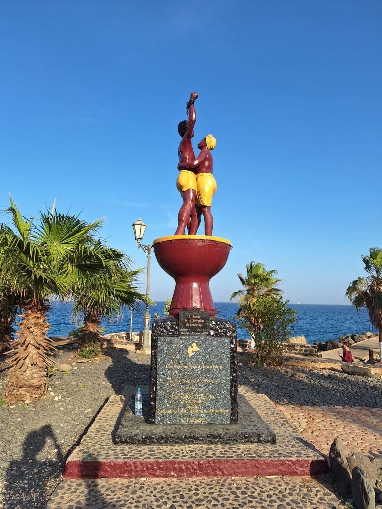 Schließlich kamen wir wieder am Hafen an. Nach kurzer Besichtigung der „Statue de liberation de l’esclavage“, Symbol für die Befreiung von Sklaverei, gab es noch ein obligatorisches Bad am dem malerischen Strand der Insel, ganz abseits der Touristenpfade.