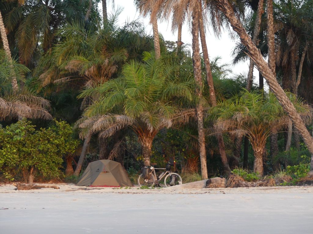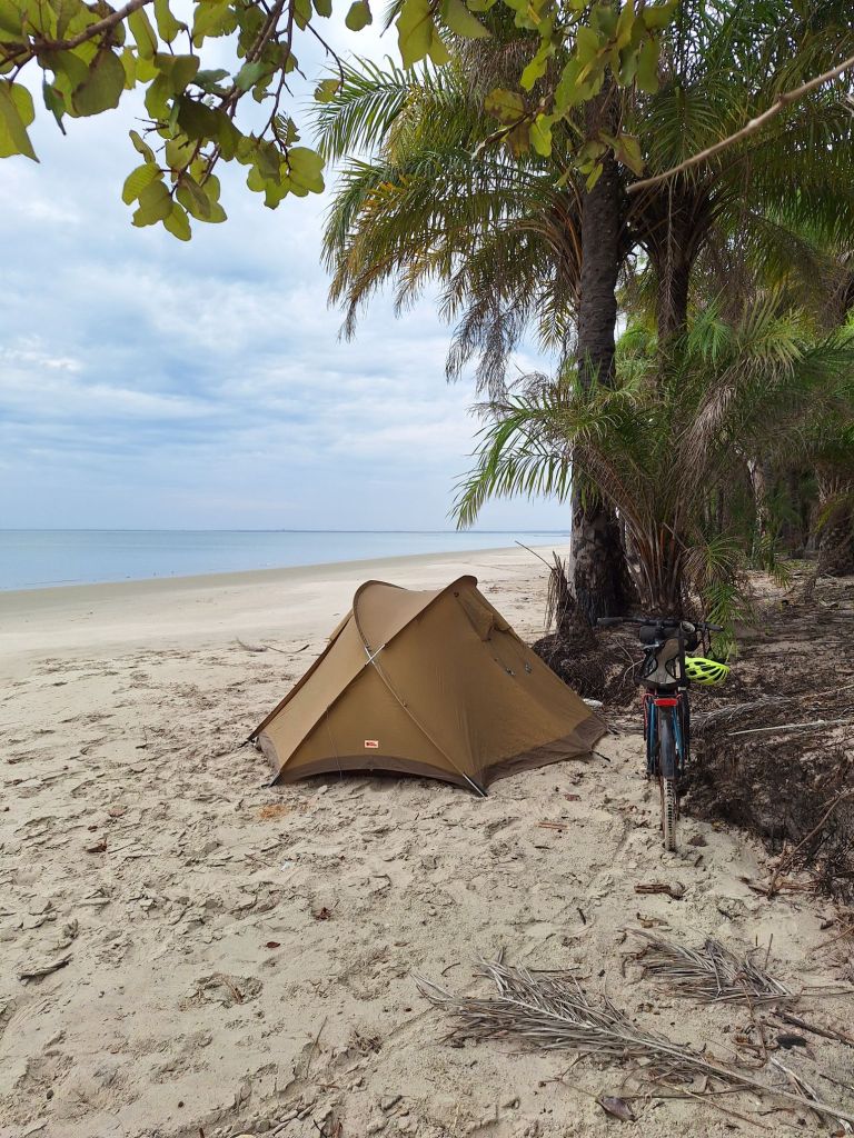 Wir erkundeten den doch nur ca. 300 Meter langen Strand, der am Rand jeweils von Mangroven begrenzt ist. Dahinter reihen sich die Palmen ein – Tropenflair wie aus dem Bilderbuch! Plätze am linken oder rechten Rand des Strandes hätten durchaus ihren Reiz gehabt, doch das Fahrrad mehr als 100 Meter durch den nicht griffigen Sand zu schieben, wäre doch mehr als anstrengend gewesen. Außerdem sahen diese Bereiche stark danach aus, als ob sie von der nächtlichen Flut überspült werden.