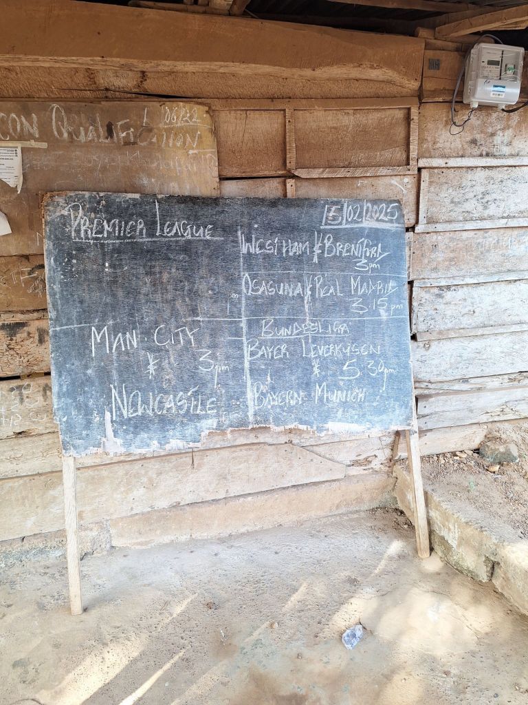 So sei es – ich war jedenfalls schon einmal sehr erleichtert aufgrund der positiven Neuigkeiten und machte mich später froheren Mutes auf den Weg zurück in die Stadt, um mich mit Timbo zu treffen. Er nahm mich dann zugleich auf seinem Motorroller mit zum dorfinternen Public Viewing. Eine groß hergerichtete Wellblechhütte, wo in vorderster Front drei Bildschirme mit drei unterschiedlichen Übertragungen installiert waren – Kino pur hier, irgendwo in der Pampa von Sierra Leone!
