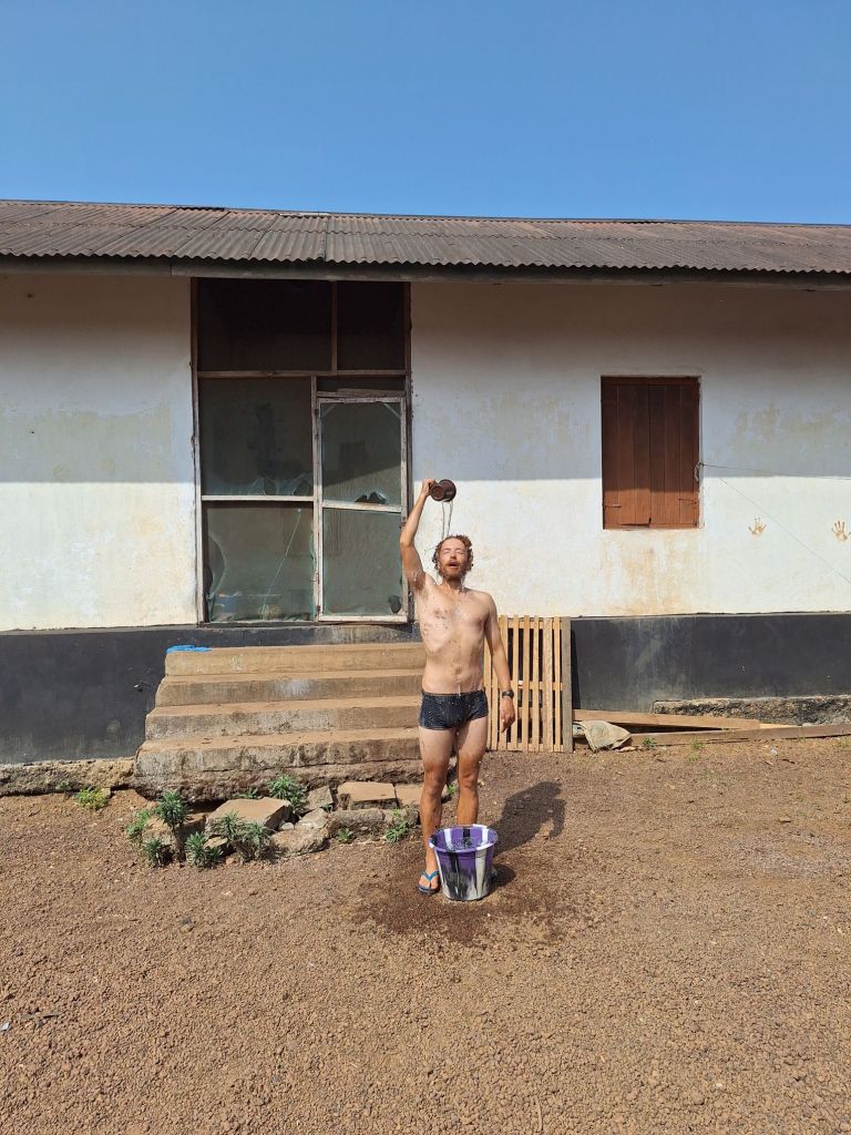 Am nächsten Morgen mussten wir dann – wie so oft – erstmal warten. Frühestens um 10 Uhr beginnt wohl die Gerichtsverhandlung. Augustin, der hilfsbereite Polizist, wollte uns dann mitnehmen zum Gerichtshof, sobald es Zeit ist. Derweil kochten wir uns auf dem Fußboden seiner Wohnung mit dem letzten noch übrigen Gas mal einen Morgenkaffee, anschließend gab’s Eimerdusche. Die Hitze war hier sonst echt kaum auszuhalten…