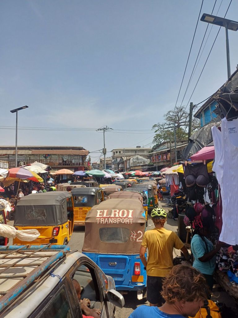 Lange Zeit führte der Weg ruhig Überland, ehe 20 Kilometer vor Monrovia Menschen, Bebauung, Chaos und Hektik deutlich zunahmen. Als wir näher an die Stadt rankamen, fanden wir uns sogar in einem großen Markt wieder, wo ein Durchkommen fast unmöglich war. Man schlängelte sich im Gehtempo zwischen Verkäufern, Besuchern und Autos vorbei. Eigentlich ein Wahnsinn, hier Fahrrad zu fahren.