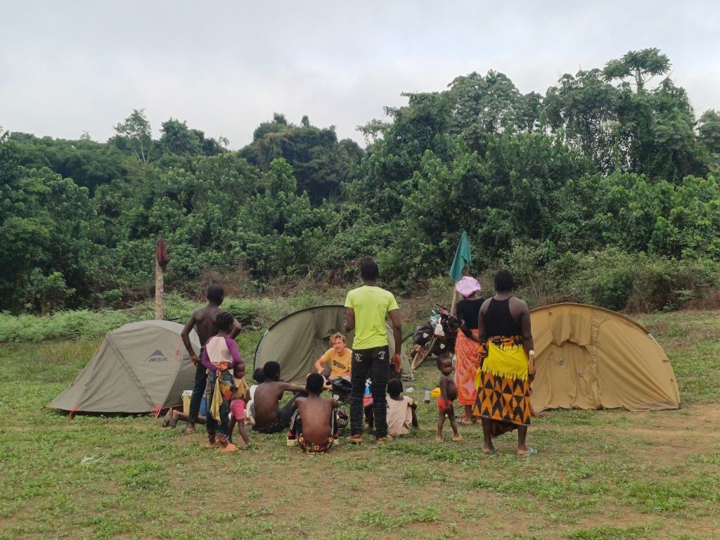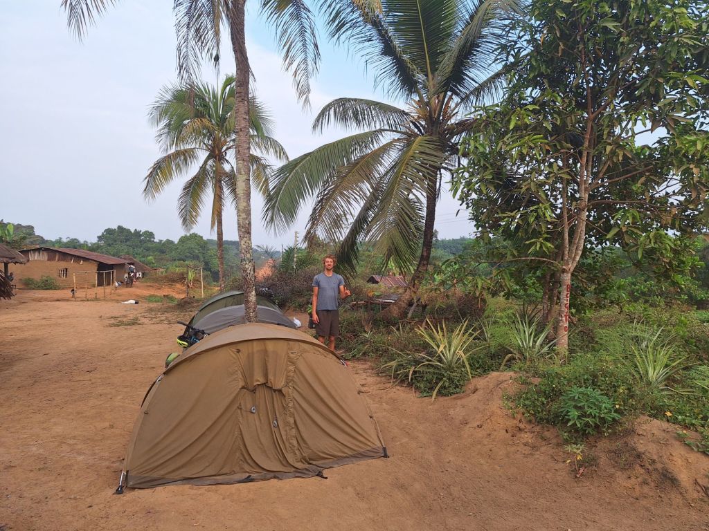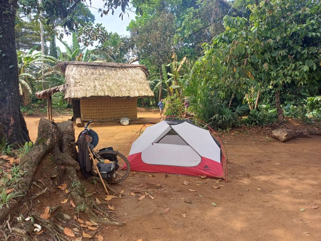 Man führte uns an den Fußballplatz des Ortes, ein schöner Platz zum Übernachten. Freilich waren wir dort nicht lange alleine. Bald war das halbe Dorf da, das uns beim Zeltaufbau umringte und ausfragte über unsere Reise. Wie bereits im vorherigen Blog erwähnt: Weiße auf dem Fahrrad hier irgendwo im Dschungel sind natürlich für die Bewohner eine absolute Rarität und somit auch ein Highlight. Locker 30 Personen scharten sich um uns. Bald sahen wir uns leider gezwungen, doch etwas Privatsphäre einzufordern. Die Bewohner hörten immerhin darauf und ließen uns in Ruhe.