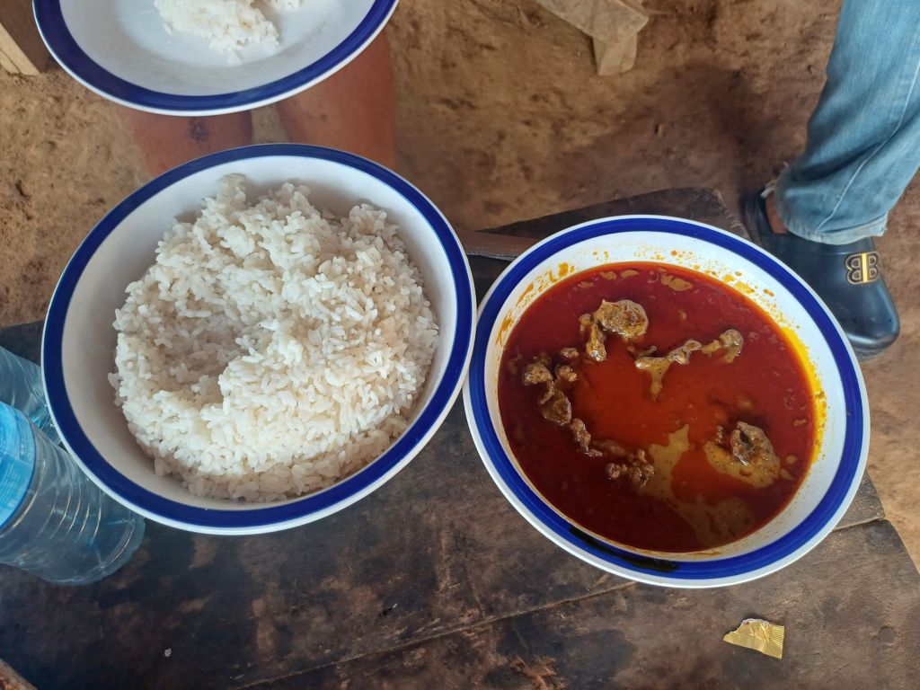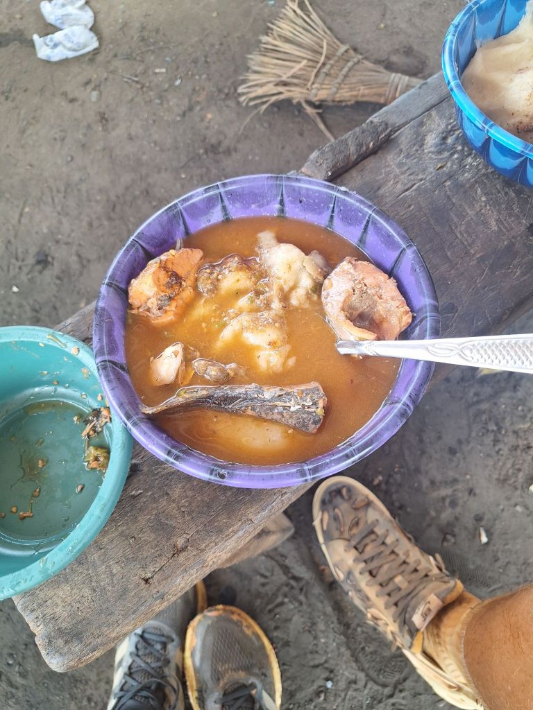 Es dauerte gefühlt eine Ewigkeit, doch am späten Mittag war das Dorf erreicht – lächerliche 20 Kilometer standen auf dem Tacho. Hier gab’s nun erstmal Mittagspause. Die Auswahl war soweit im Dschungel jedoch natürlich begrenzt. Man konnte mir lediglich gestampfte Kartoffeln mit Fisch und extrem scharfer Soße anbieten. Ich konnte es aufessen, bis aber ehrlicherweise lebendig gestorben dabei 😵