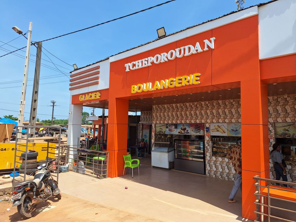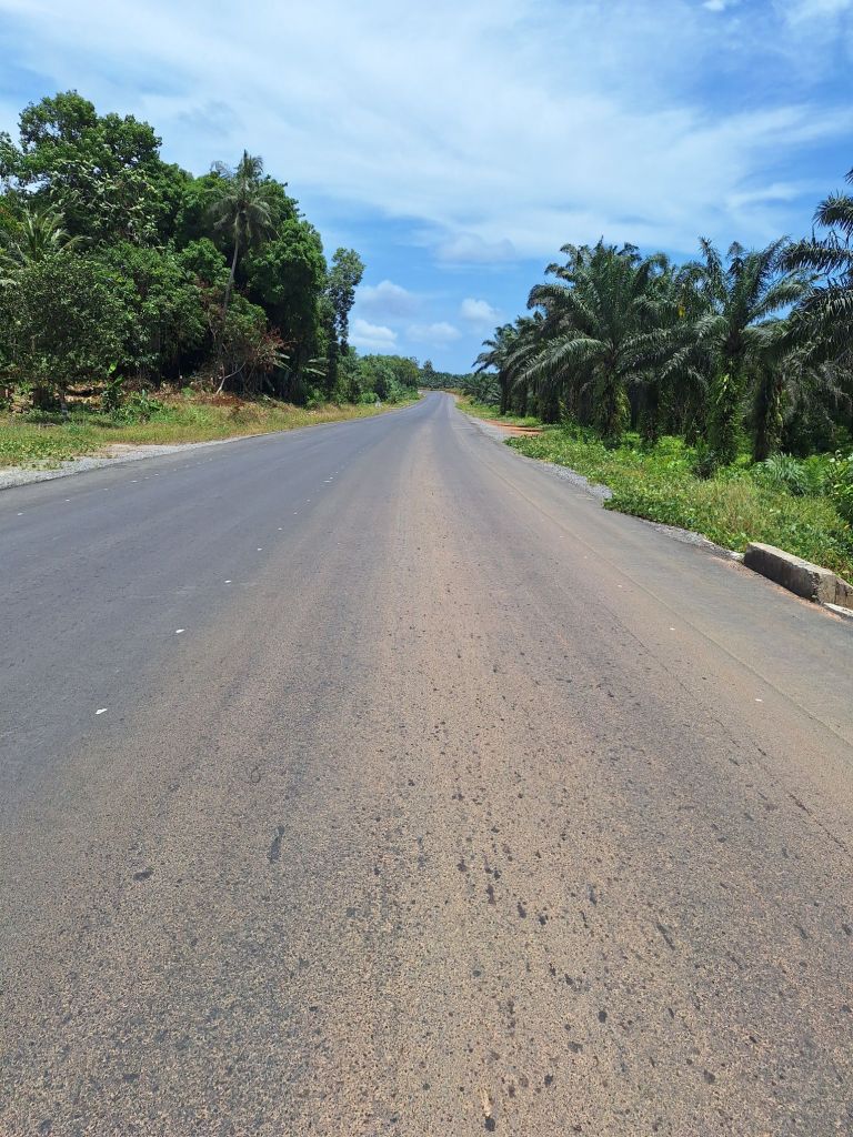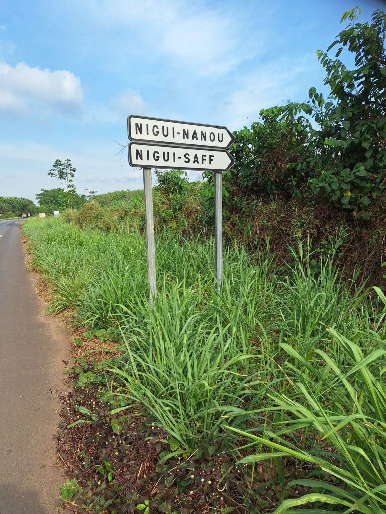 Ein interessanter Kontrast zu Liberia war, dass nun jedes Dorf, das wir passierten, mindestens einen kleinen Supermarkt besaß. Ja, sogar große Bäckereien pflasterten unseren Weg. Außerhalb der Dörfer war der Weg aber fast etwas eintönig. Ja, auch die Vegetation am Straßenrand bot kaum Abwechslung…lediglich der ein oder andere Fluss oder lustige Ortsname auf dem Weg gestaltete unsere Fahrt etwas kurzweiliger.