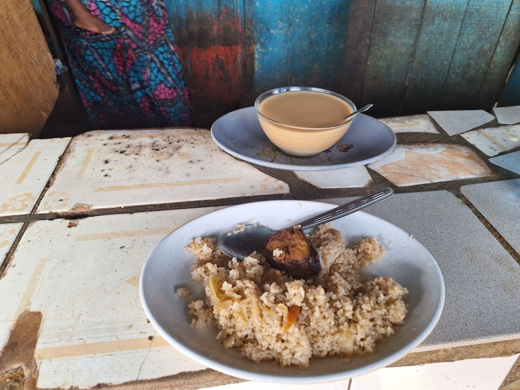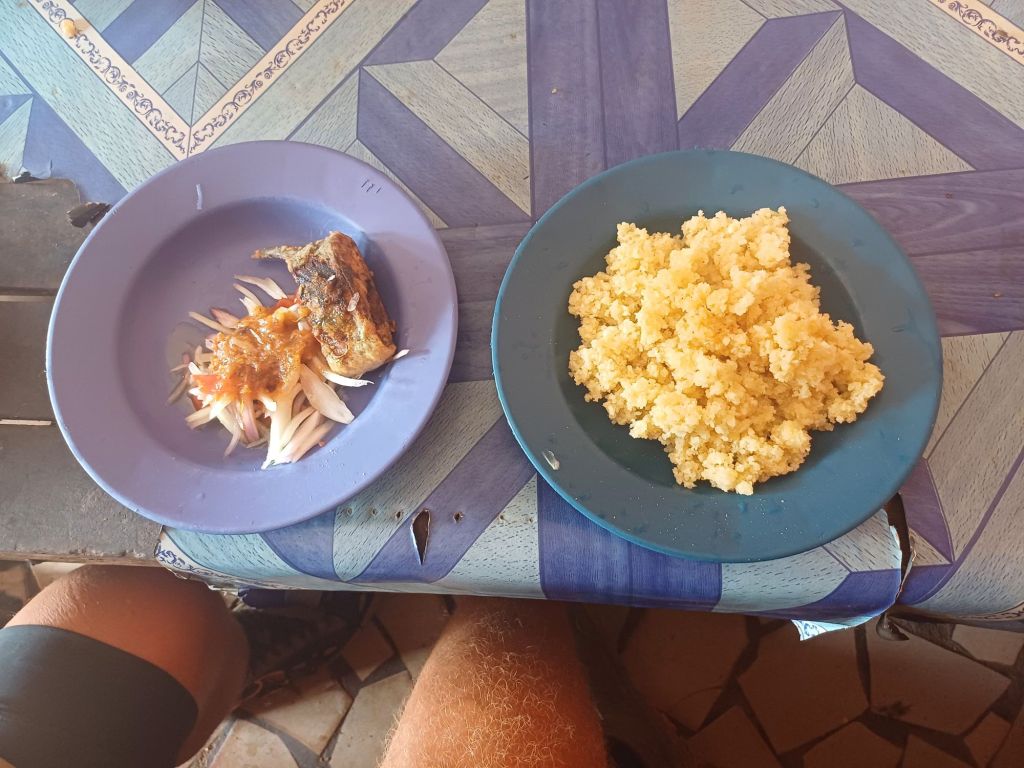 Nach obligatorischer Handwäsche verließen wir die Unterkunft nur noch für ein Abendessen beim Markt direkt um’s Eck. Für mich gab’s wiederum Attieké mit Fisch und auch frischem Gemüse. Für meinen Körper fast schon eine Überflutung an Nährstoffen nach der doch sehr spärlichen Lebensmittelauswahl im Dschungel.