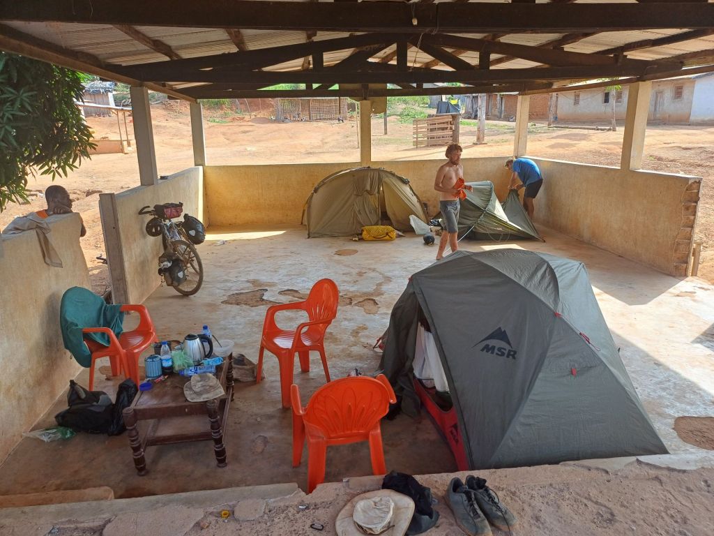 Nachdem wir unser im vorherigen Blogbeitrag angesprochenes Soll von 62 Kilometern erfüllt haben und ein Dorf direkt neben einem Sendemast auf dem Weg lag, fragten wir hier nach einem Übernachtungsplatz. Wir wurden zum Chef du village geführt, welchem wir uns vorstellten. Es war gar nicht so einfach, nach zwei englischsprachigen Ländern nun wieder auf Französisch zu switchen…