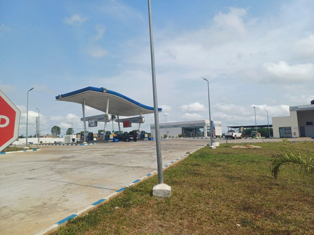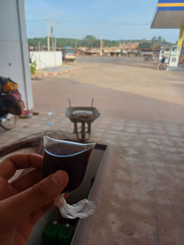 Nach einem langen Hügel kurz vor dem Örtchen Yocoboué machten wir an einer moderneren Tankstelle noch einmal eine kurze Pause, weil Jannick noch einmal akut das stille Örtchen aufsuchen musste.