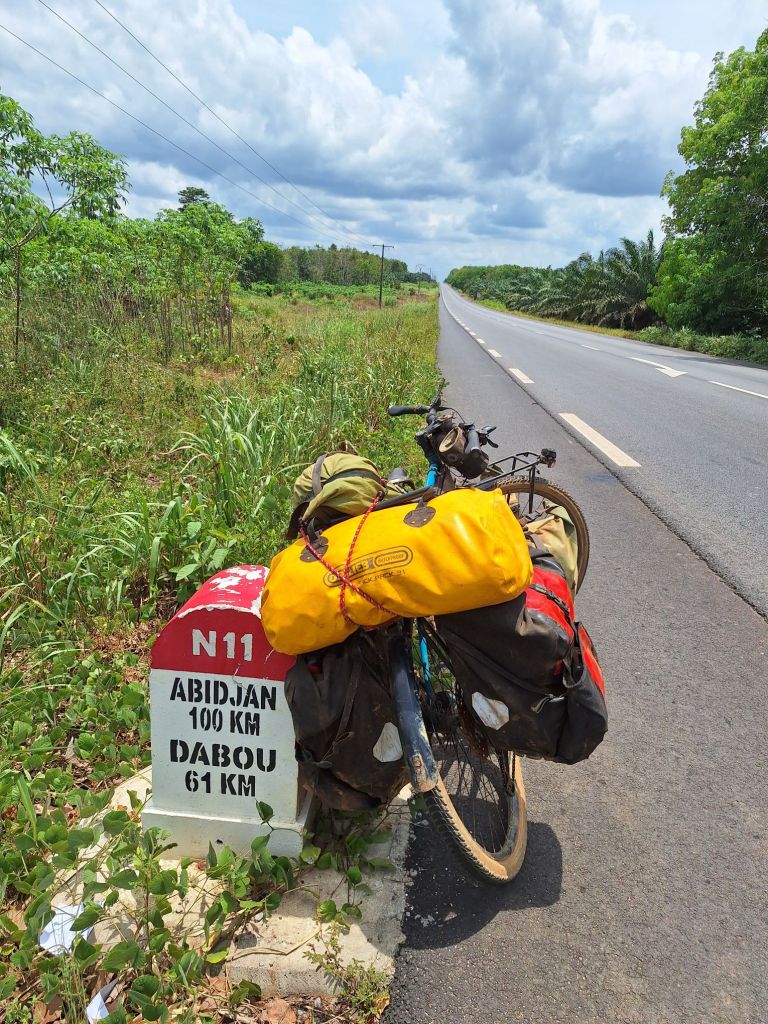 Dennoch rollte es gut, ich fühlte mit der Vorgeschichte erstaunlich fit und trat mit viel Energie in die Pedale. Schnell war die nächste Kleinstadt Grand-Lahou erreicht. Ein Straßenschild zeigte an: Noch 112 Kilometer bis Abidjan. Blöd nur, dass unser Apartment im Osten der Stadt lag und diese Entfernung nur bis zum Beginn der Stadt galt…