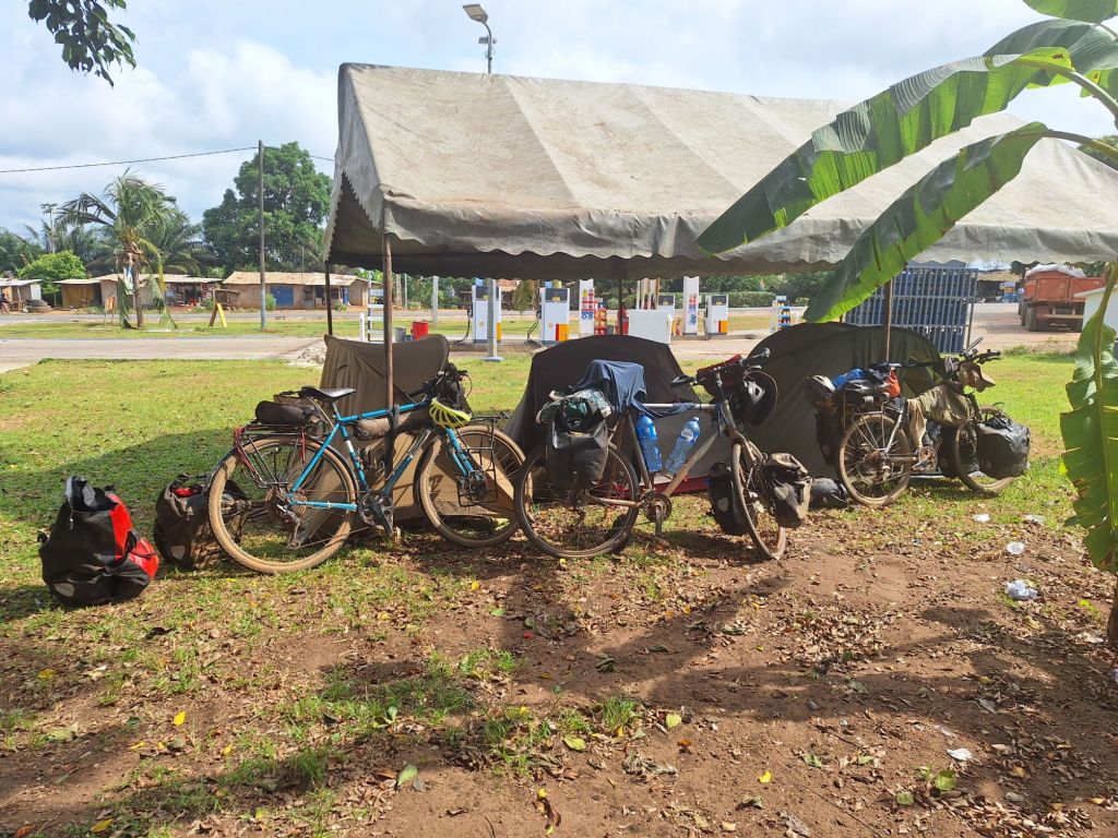 Die Kleinstadt Sassandra war durchaus belebt mit viel Verkehr und einem großen Straßenmarkt. An einer Shell-Tankstelle fragten wir schließlich nach Zeltaufbau, den man uns neben der Waschanlage genehmigte. Wir bauten unsere Zelte auf und hofften, dass die Straße bis zum späten Abend schon deutlich ruhiger werden würde.
