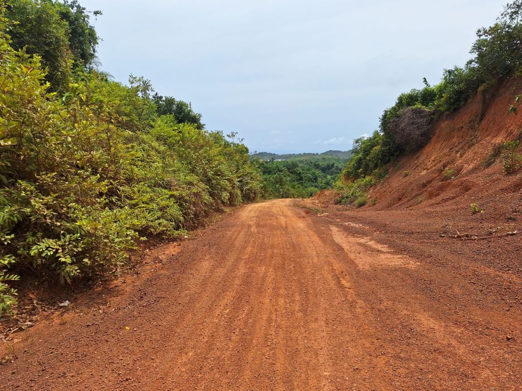 Der Weg führte zunächst über eine klassische Gravelpiste, gleich zu Beginn gab es zwei wahrlich knackige Anstiege von geschätzt knapp über 10 Prozent, aufgrund des Schotters kamen kurze Erinnerungen an den Dschungel in Liberia hoch. Sie waren im untersten Gang gerade so tretbar, ehe man oben noch einmal einen letzten Rückblick auf die Südspitze Ghanas werfen konnte.