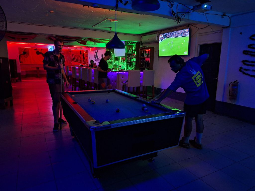 Am Abend rundete Sam unseren Tag unseren Aufenthalt in Takoradi wiederum mit dem Besuch einer europäisch anmutenden Bar ab – inklusive Pizzaessen, zwei Fernsehern mit Live-Fußball und Billiardtisch. Die Künste beim Spielen von Letzterem waren aber ehrlicherweise nie überragend und sind nach all den Monaten nochmals abgestumpft – dabei sein ist alles! 😉