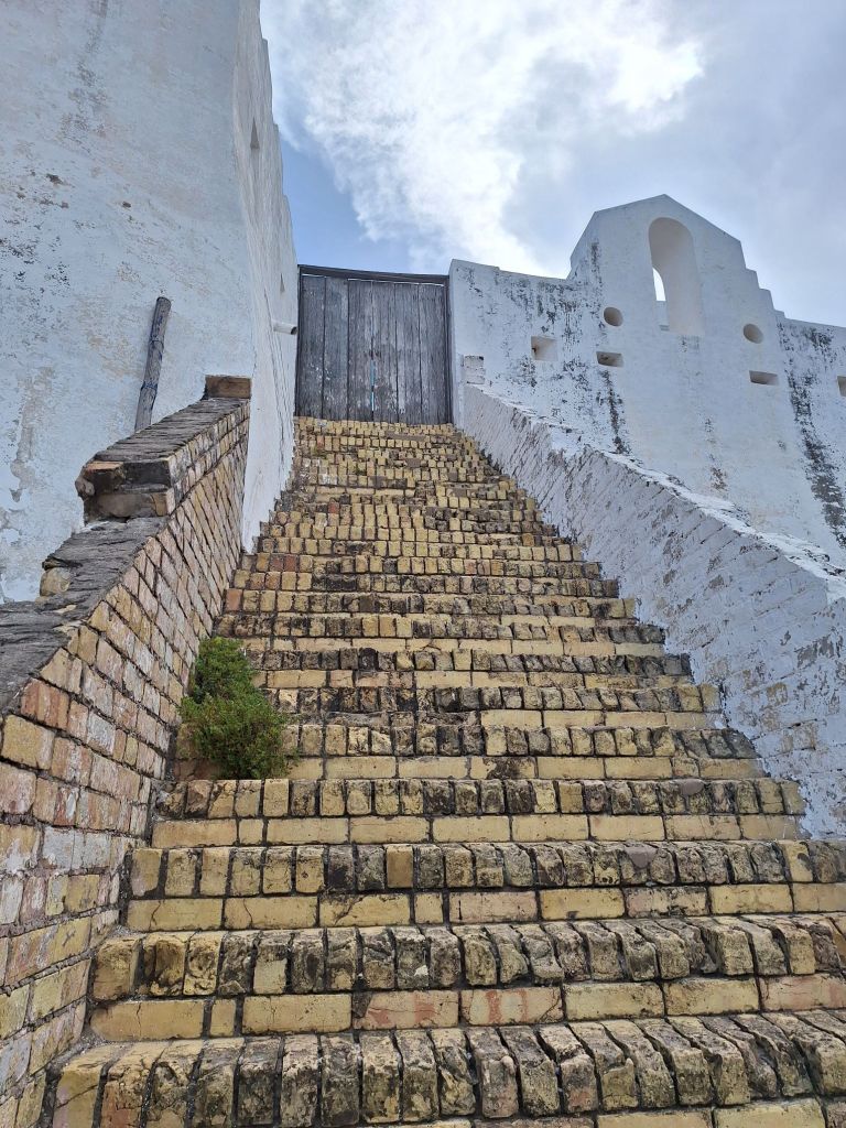 Zudem zeigte der Guide uns den Zugang zu einem unterirdischen Tunnel, durch welchen die nach Amerika deportierten Sklaven direkt auf das Schiff kamen, ohne ans Tageslicht zu kommen. Da dieser Ausgang jedoch oftmals von Turbulenzen wie Sturmfluten und heimgesucht wurde, wechselte man zu einem Ausgang in eine ehemals geflutete Bucht hinter der Burg, gekennzeichnet mit der berühmten „Door of no return“. Nach Ende der Sklaverei wurde die Rückseite der Tür symbolisch zur „Door of Return“ für nach Amerika deportierte Sklaven: Eine Rückkehr ist möglich!Heute herrscht hier Ebbe und die Bucht ist durch einen Fischmarkt inklusive Hafen gekennzeichnet. Direkt daneben ist ein Treppenzugang nur für die britischem Kolonialisten zum Obergeschoss der Burg, um nicht mit den Sklaven in Kontakt zu kommen.