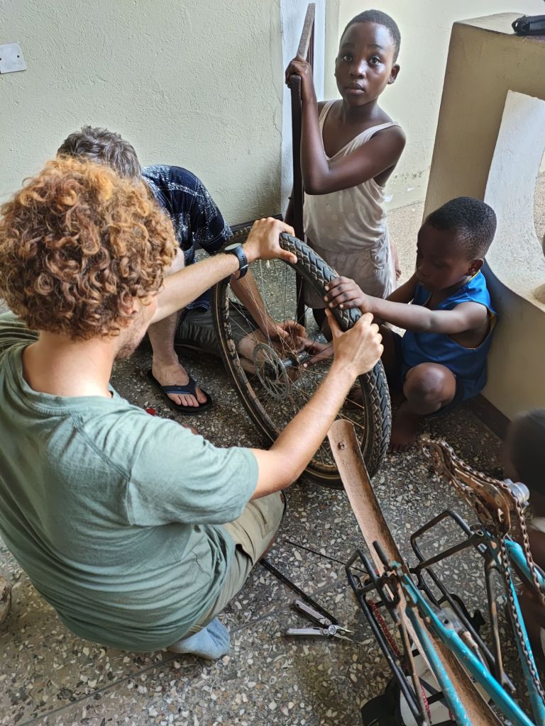 Dank meines Ausrüsters Hannes hatte ich die passenden Ersatzspeichen im Gepäck. Also ging die Prozedur los: Rad ausbauen, Kasette ausbauen, Bremsscheibe ausbauen. Eine alte Kette in Jannicks Gepäck konnten wir als Kettenpeitsche improvisieren, um die Kasette zu lösen. Anschließend setzte Sam die Speiche akkurat ein, während ich zusah und lernte, wie man außerdem die Spannung reguliert. Alle anderen Speichen bedurften nämlich ebenfalls einer Kontrolle. Schließlich wurde alles wieder zusammengebaut und mein Fahrrad hoffentlich soweit wieder fit. Da hatte ich mal wieder Glück! Vielen lieben Dank, Sam! Nun spare ich mir wohl sogar den Fahrradladenbesuch in Accra!