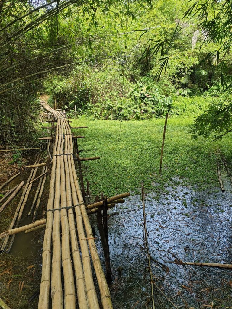 Schließlich mussten wir abenteuerlich einige Teiche über instabile Bambusbrücken überqueren. Zwischendrin rutschte sogar das Fahrrad zwischen die zusammen geknoteten Bambusstöcke und musste wieder herausgewuchtet werden, während man auf dem engen Raum irgendwie das Gleichgewicht halten musste.