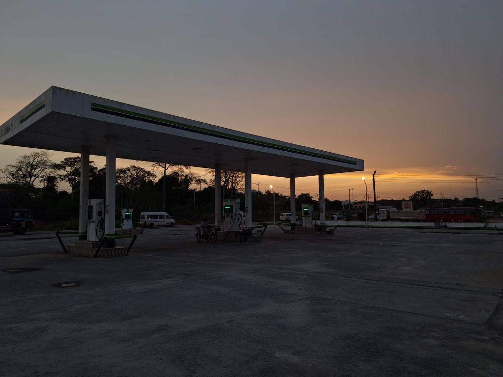 Blöd war nur, dass die ganze Anlage in der Nacht hell beleuchtet war. Jannick machte so etwas nichts aus, ich kann so im Zelt jedoch kaum ein Auge zudrücken, also musste ich unter das Dach der Tankstellenräumlichkeiten ausweichen, wo sich die tropische Hitze noch einmal staute. Hier war es zwar dunkel, der Schweiß rinnte mir jedoch am ganzen Körper geradezu herunter. Letztendlich konnte ich schlafen und in der Nacht wurde es etwas angenehmer, doch die Handwäsche von Kopfkissen und Luftmatratze war so natürlich nach einer Nacht wieder für die Katz…