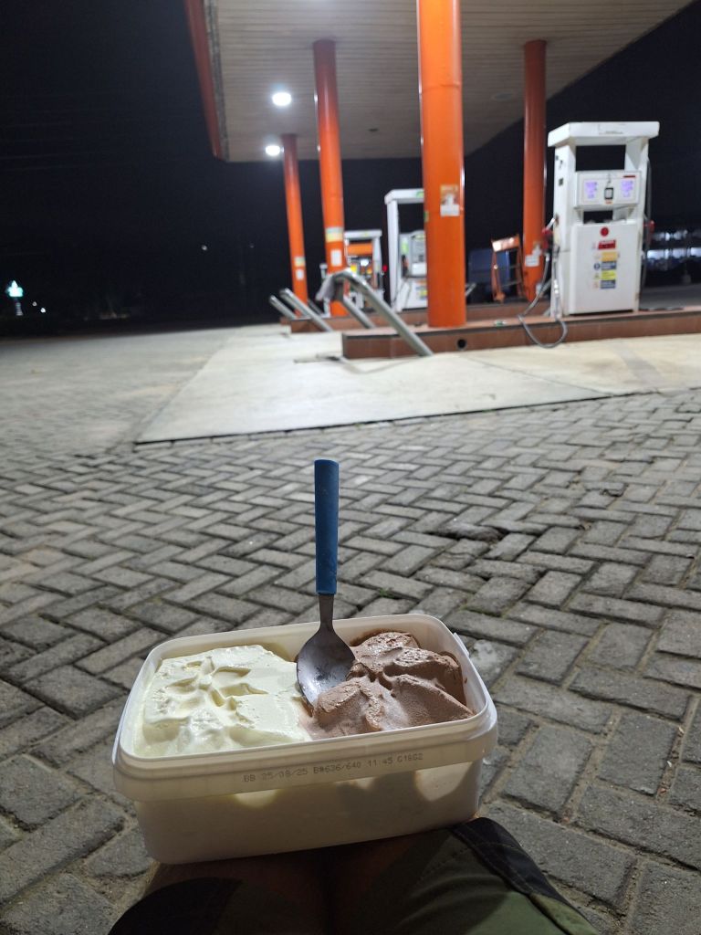 Bei der siebten Tankstelle gab es schließlich die Erlösung. Noch besser: Es wurde uns sogar ein Raum mit zwei Matratzen angeboten – von der Verzweiflung direkt zum Luxus! Im Shop nebenan gab’s dann erstmal Nervennahrung und ein ganzer Pott Eis wurde vernichtet 😉