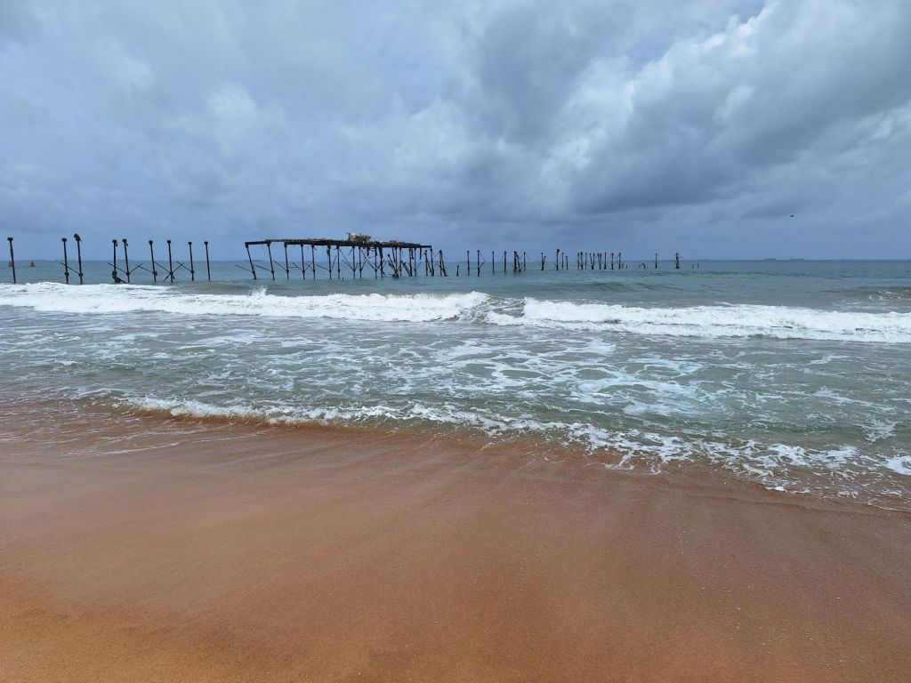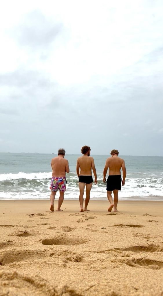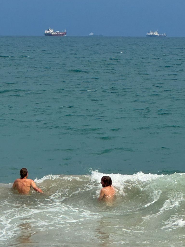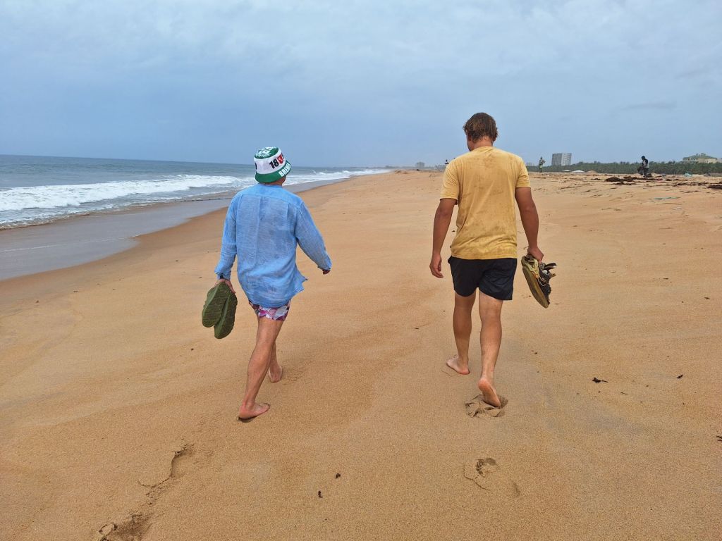 Fast wieder auf Höhe von unserer Unterkunft legten wir dann nach dem Duchwaten eines Flusslaufes, der den Strand einmal teilte, aufgrund der Hitze noch einmal eine Badepause am Strand ein. Schnell wurden viele Hilfsarbeiter beim Fischen nebenan auf uns aufmerksam, Kinder wollten mit uns baden. Da die Strömung und Wellen doch ein elementares Schwimmkönnen erforderten, bat uns ein Fischer, wieder aus dem Wasser zu gehen – wir sind wohl ein schlechtes Vorbild für die neugierigen Kinder.