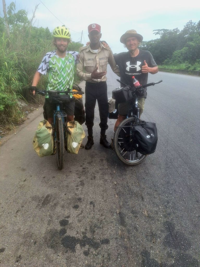 Ca. 20 Kilometer vor dem Ziel wurde es dann langsam stressig, da der Einzugsbereich von Benin-City begann. Hier hielt uns noch einmal ein Polizist an, um mit uns ein Foto zu machen – Schusswaffe inklusive 😉 Bei solchen speziellen Selfies lässt man sich natürlich nicht lumpen.