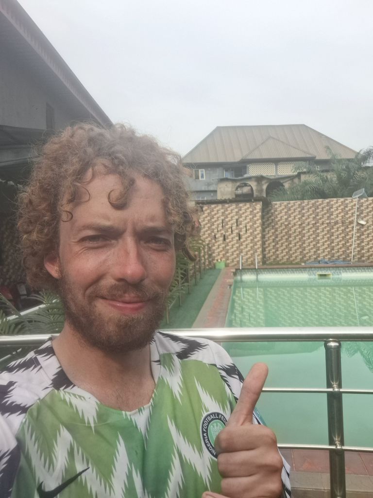 Wenn etwas bei den Nigerianern auffällig ist, dann ihr Style: Sie laufen alle sehr modisch gekleidet herum. Auch auf der Straße gab es allerhand Shops, wo man sich mit durchaus ansehnlichen Kleidungsstücken eindecken konnte. Eines fiel mir schon am Vortag ins Auge. Aus Transportgründen entschied ich mich jedoch dagegen. Nun kam ich wieder an dem Laden vorbei und wurde schwach – das Hemd landete in meinem Gepäck. Fündig wurde ich nun auch bezüglich eines Nationaltrikots von Nigeria: Ich besorgte mir jenes, das bei der WM 2018 getragen wurde – ein weiteres Stück für die immer größer werdende Sammlung! Der freudige Verkäufer wollte natürlich gleich noch ein gemeinsames Bild, wenn er schon mal einen weißen Abnehmer fand.