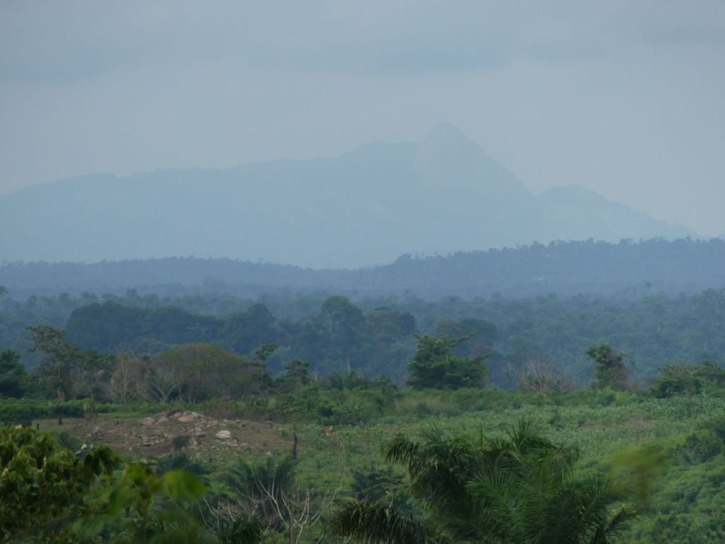Das hört sich jetzt nicht so abwechslungsreich an, war es ehrlich gesagt auch nicht. Immerhin war die Fahrt jedoch von zahlreichen kleineren und ein paar etwas größeren Hügeln geprägt, wodurch man immerhin manchmal einen prächtigen Ausblick auf die Dschungellandschaft ringsherum hatte, sogar ein Berg zeigte sich am Horizont Richtung Nordosten. Wobei ich jedoch echt ratlos war, um welches Gebirge es sich hier im Südwesten Nigerias handeln könnte…