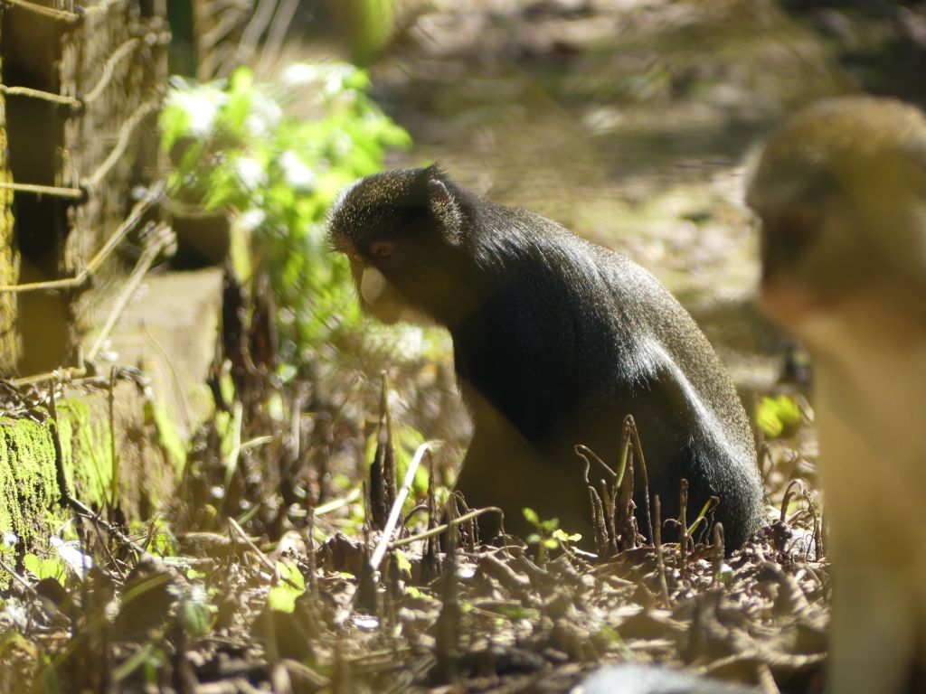 Nach dem Spaziergang durch den Dschungel ging es noch zu den Monameerkatzen sowie den großen Weißnasenmeerkatzen. Hier war die Beobachtung schwieriger, da die Temperatur bereits aufgrund der Tageszeit deutlich angestiegen ist und diese Schatten suchten in den Bäumen und Büschen. Zudem sind diese etwas schüchterner als bspw. Schimpansen. Dennoch konnten wir zwei neugierige Tiere beobachten und festhalten.